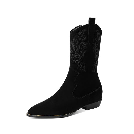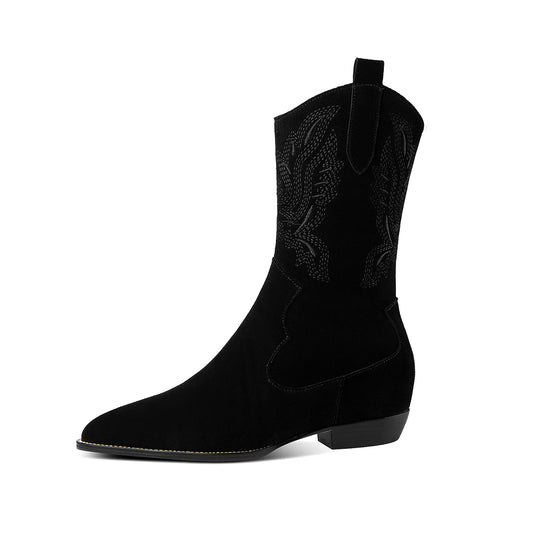 TinaCus Handmade Women's Suede Leather Ethnic Floral Embroidered Round Toe Mid Chunky Rhinestone Heel Back Zipper Mid-Calf Boots