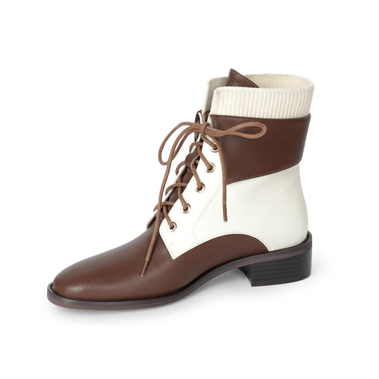 Tinacus Genuine Leather Square Toe Chunky Front Zipper Mid Calf Boots