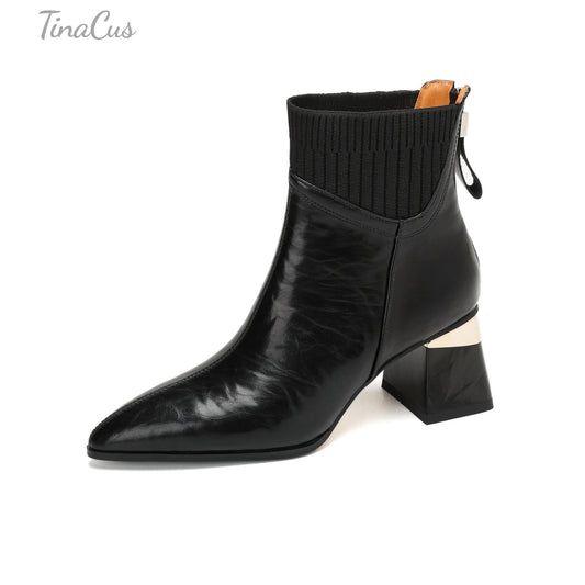 TinaCus Women's Pointed Toe Genuine Leather & Knitted Fabric Handmade Chunky Heels Zip up Ankle Boots
