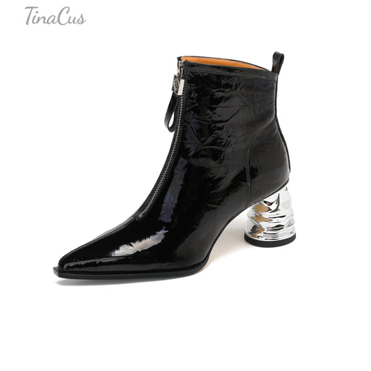 TinaCus Patent Leather Women's Pointed Toe Handmade Front Zipper Mid Chunky Heels Chic Ankle Boots