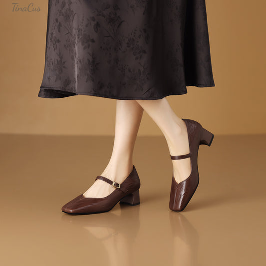 TinaCus Women's Square Toe Genuine Leather Handmade Strap Buckle Low Chunky Heels Mary Jane Pumps Shoes