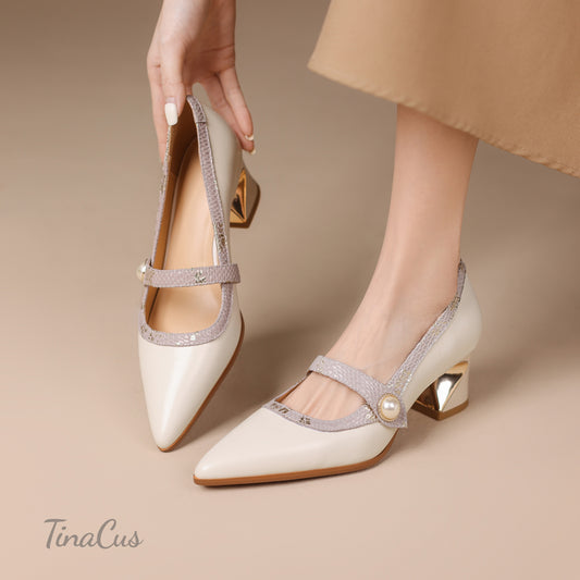 TinaCus Genuine Leather Women's Pointed Toe Handmade Chunky Heels Elegant Dress Pumps Shoes