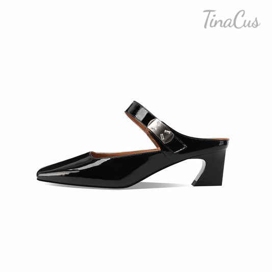 Tinacus Genuine Leather Pointed Toe Chunky High Heel Mules Plus-size Pump