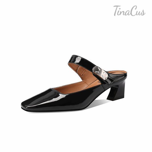 TinaCus Women's Glossy Patent Leather Handmade Closed Toe Cone Heel Mule Sandals with Sparkling Glitter