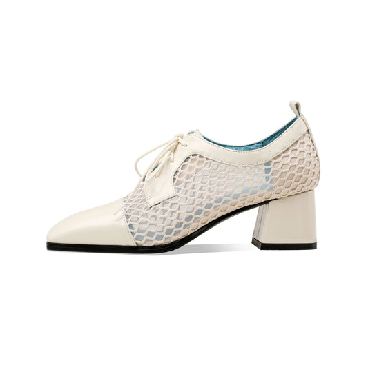 TinaCus Women's Genuine Leather with Breathable Mesh Square Toe Handmade Lace-Up Low Chunky Heels Pumps Shoes
