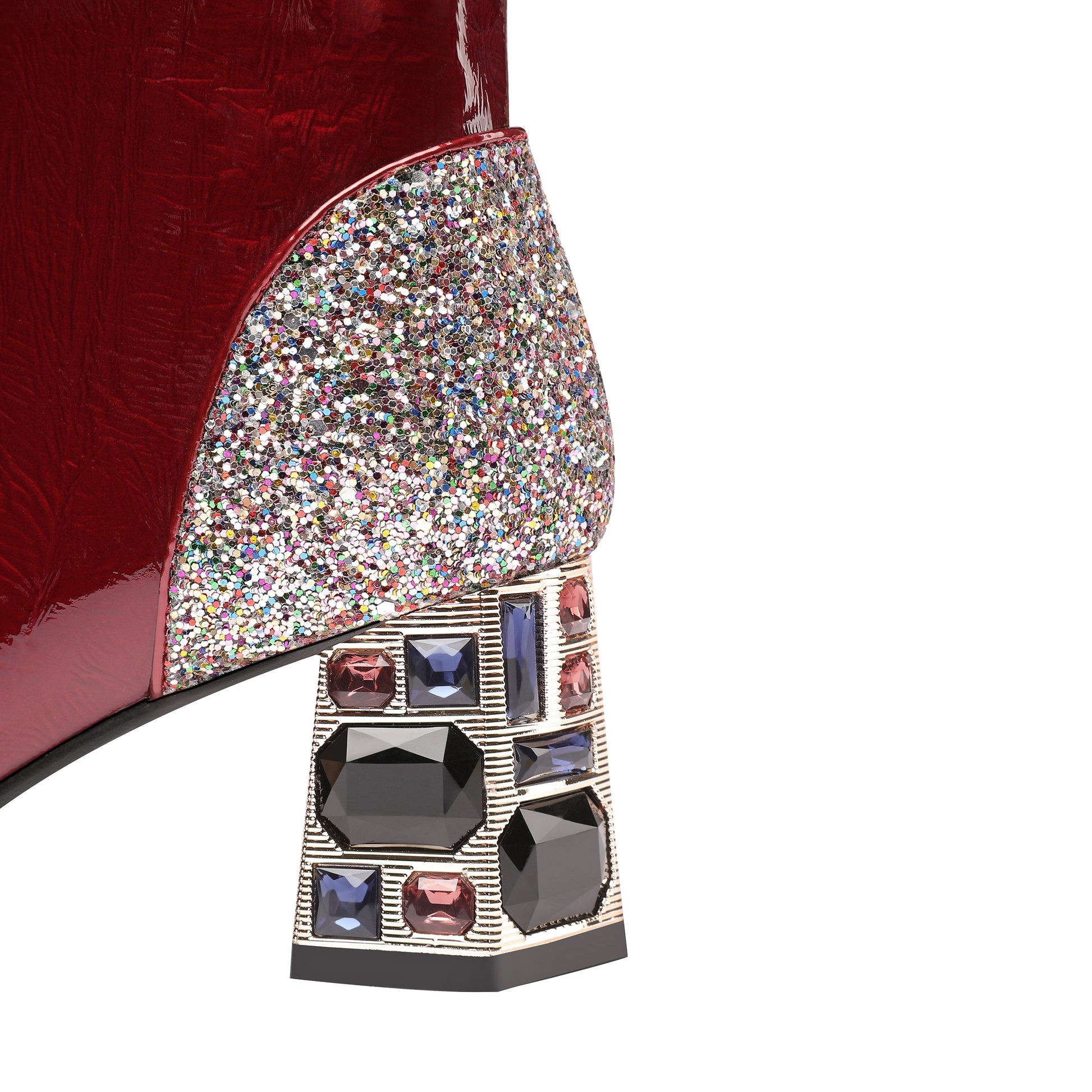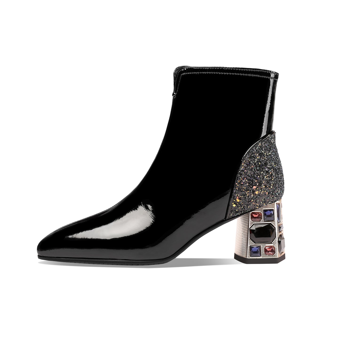 TinaCus Women's Handmade Patent Leather Clear Pointed Toe Crystal Decor Chunky Heel Side Zip Sparkling Glitter Ankle Boots