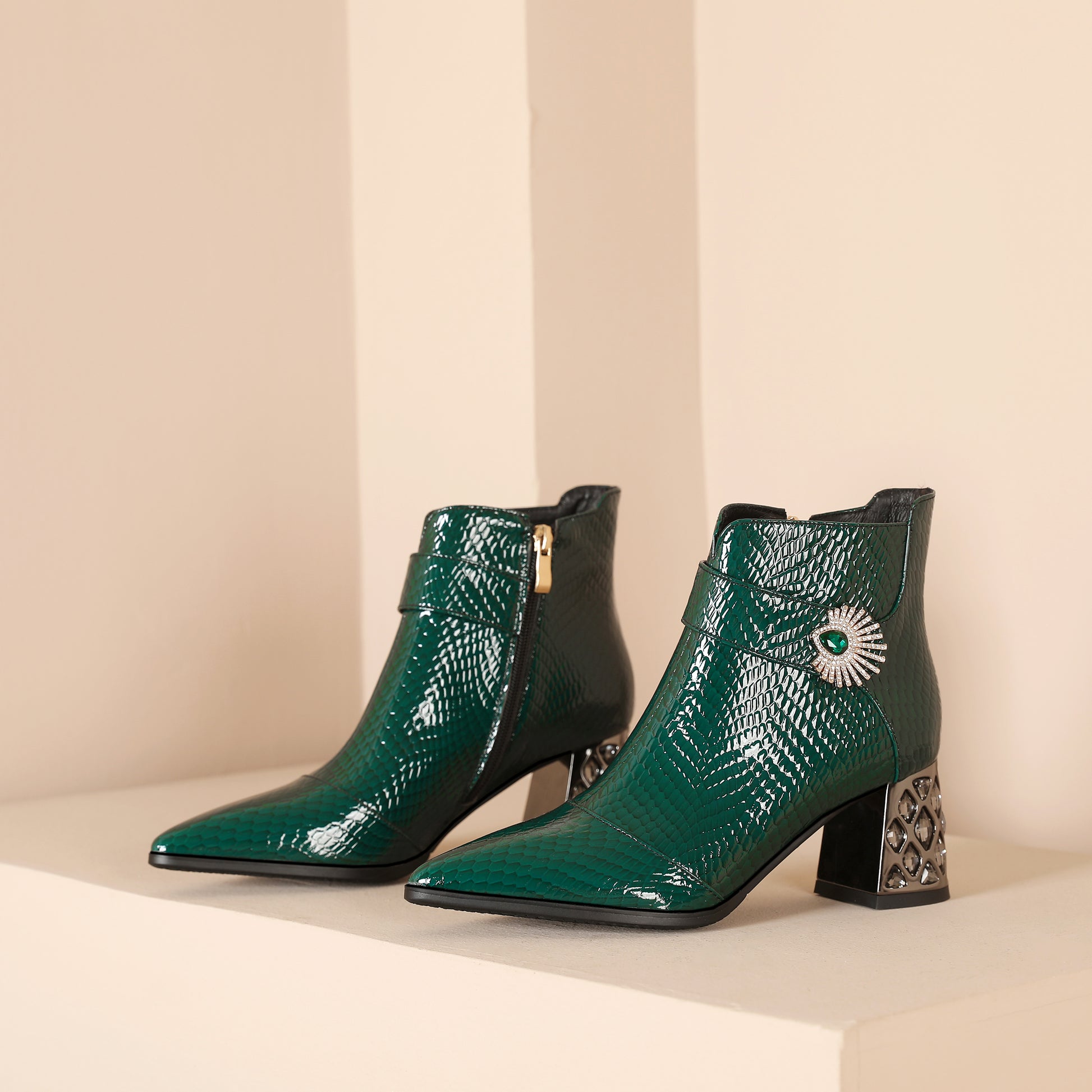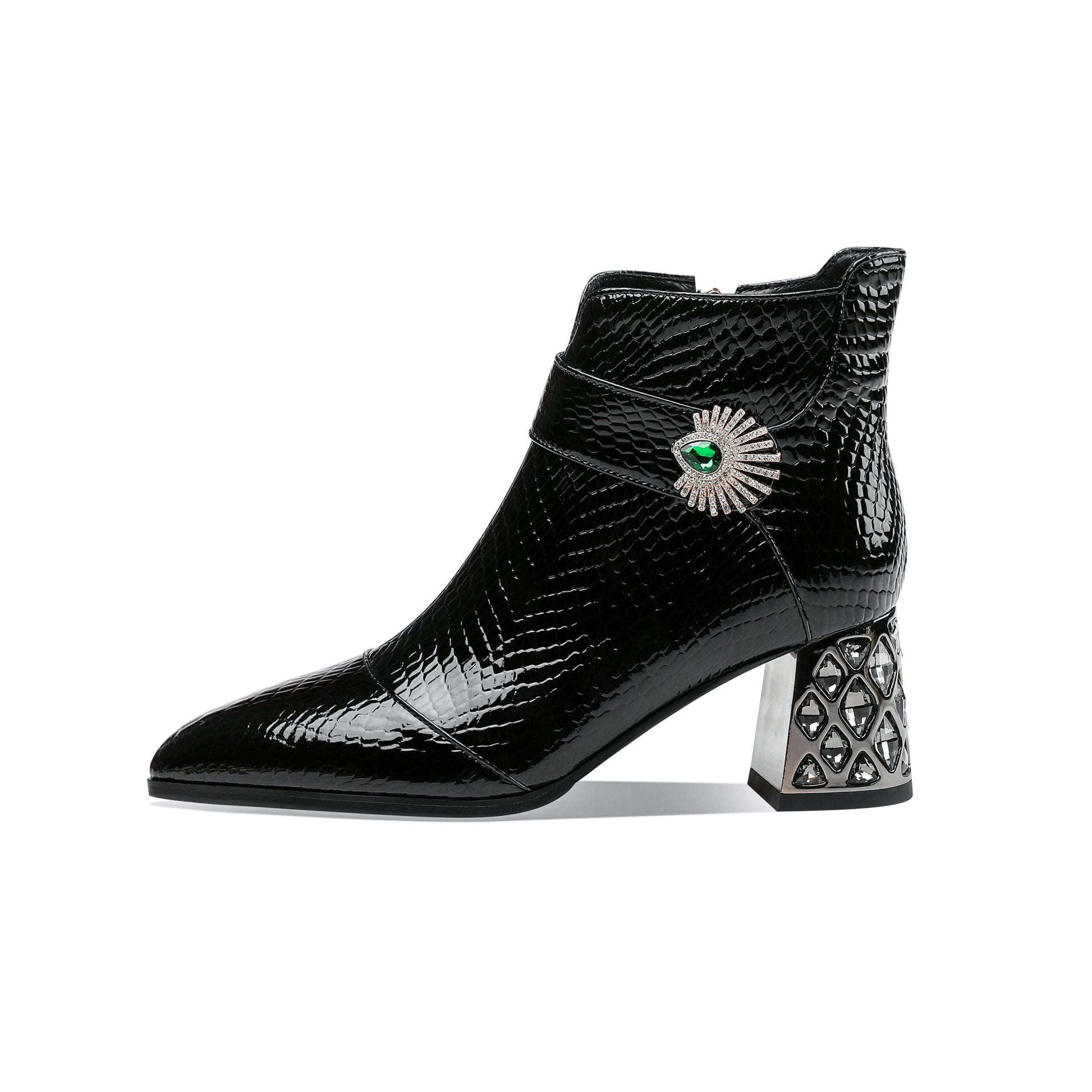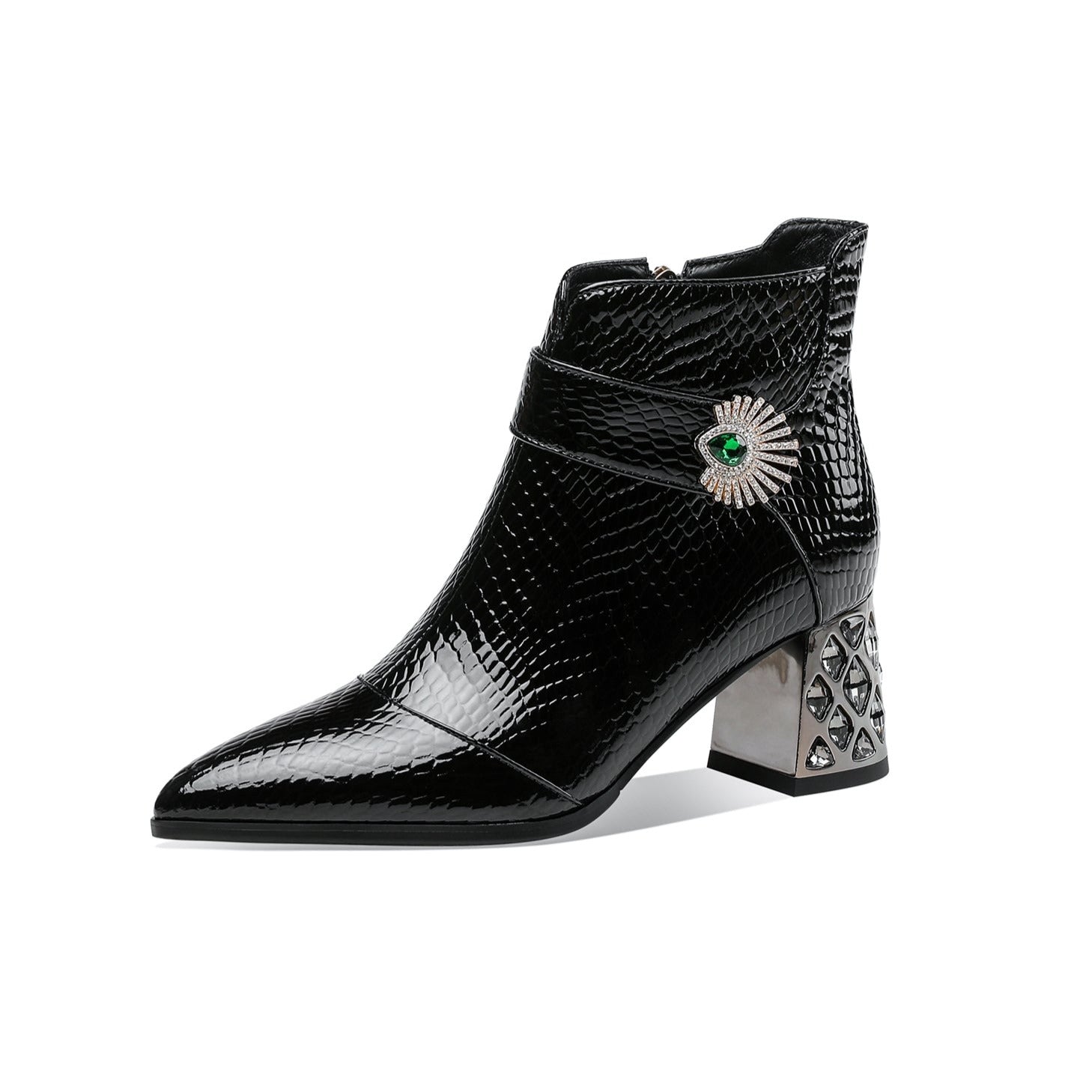 TinaCus Handmade Women's Patent Leather Side Zipper Pointed Toe Mid Rhinestones Chunky Heel Ankle Boots