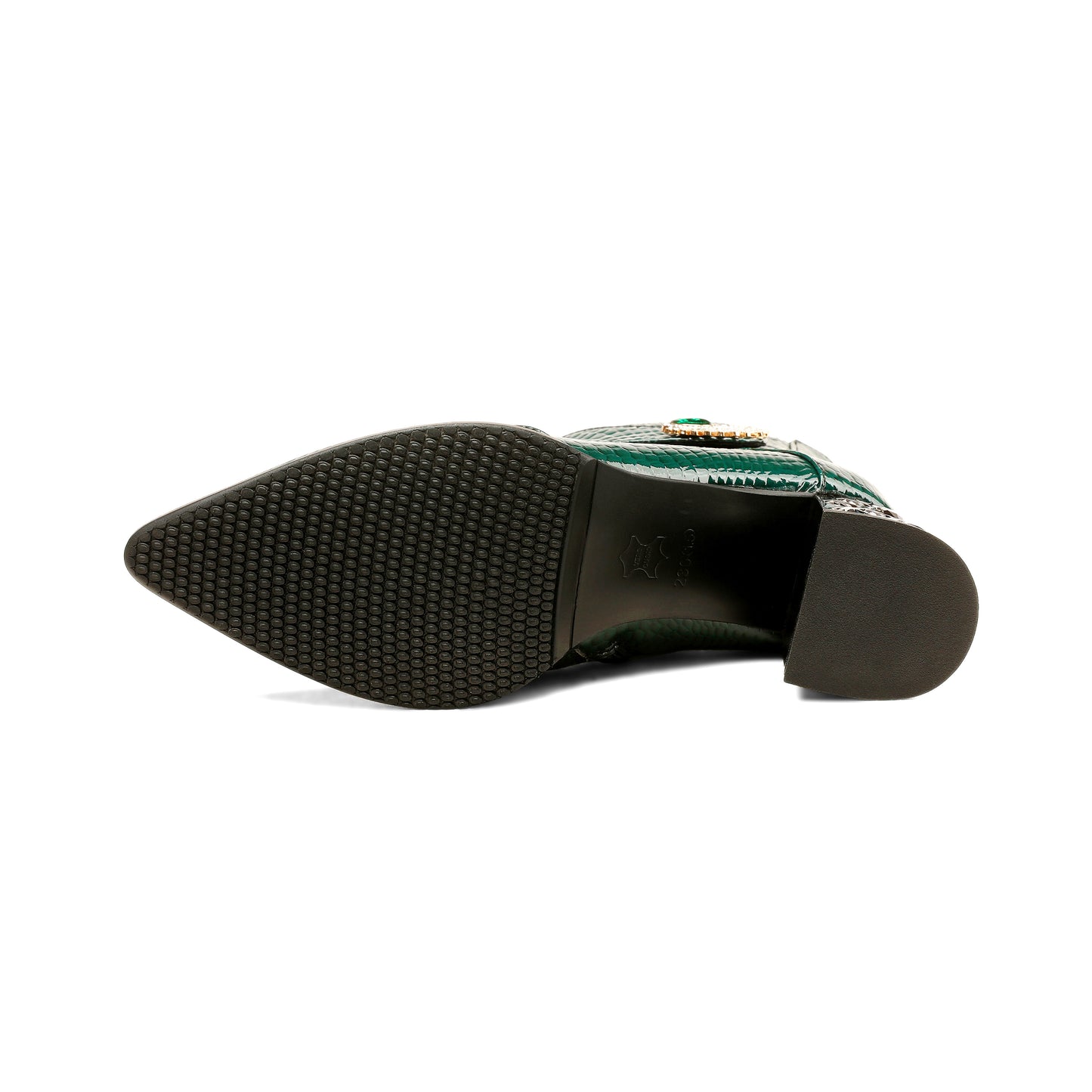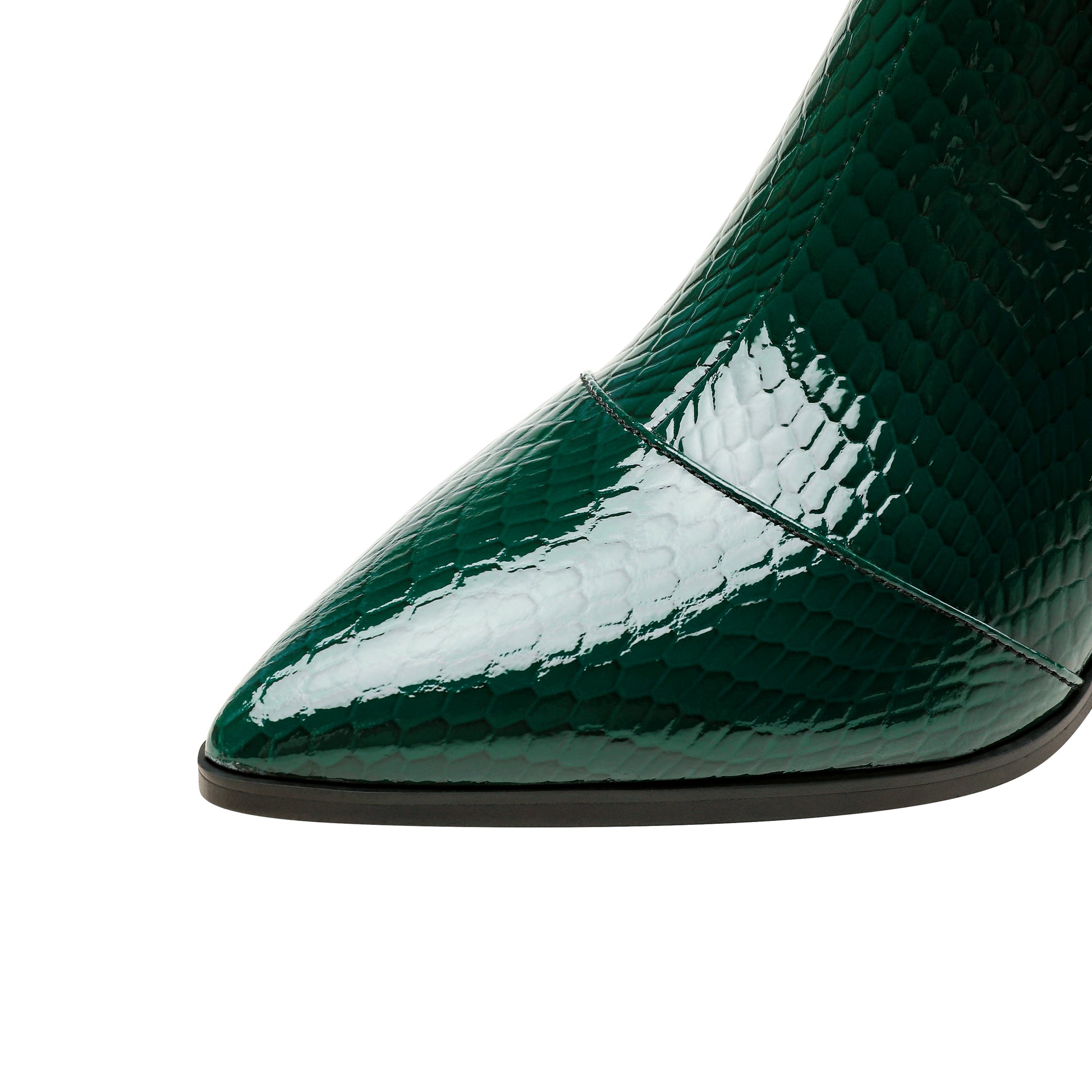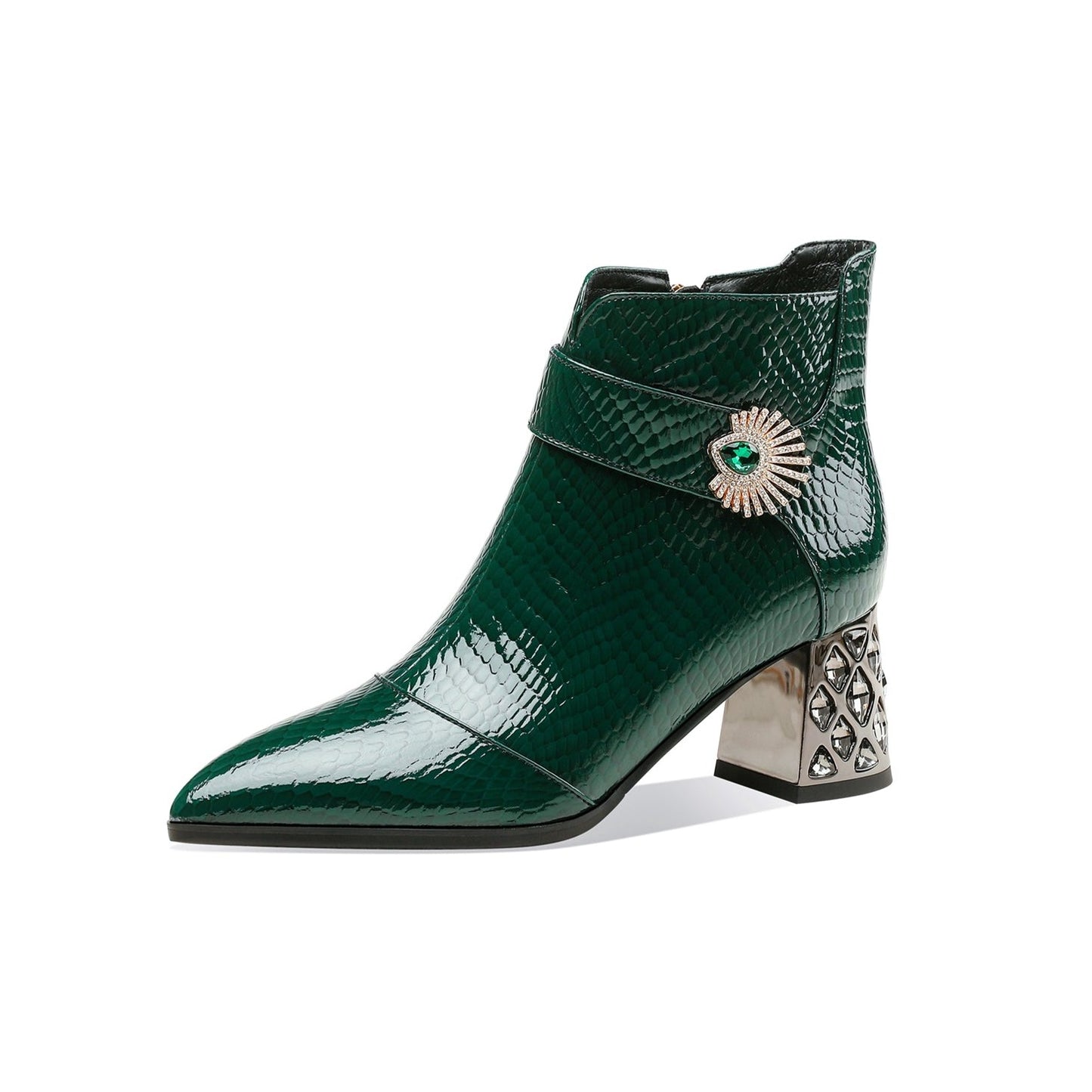 TinaCus Handmade Women's Patent Leather Side Zipper Pointed Toe Mid Rhinestones Chunky Heel Ankle Boots