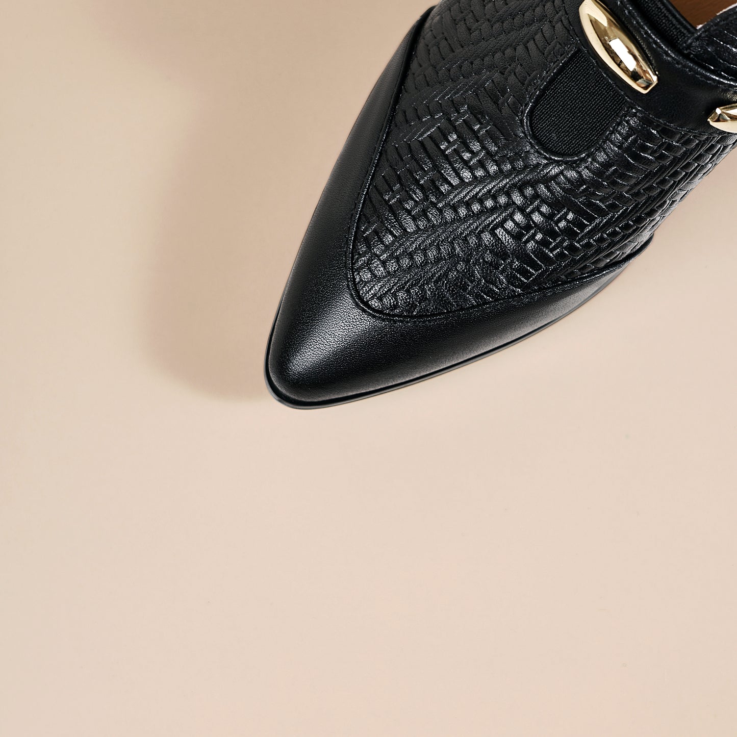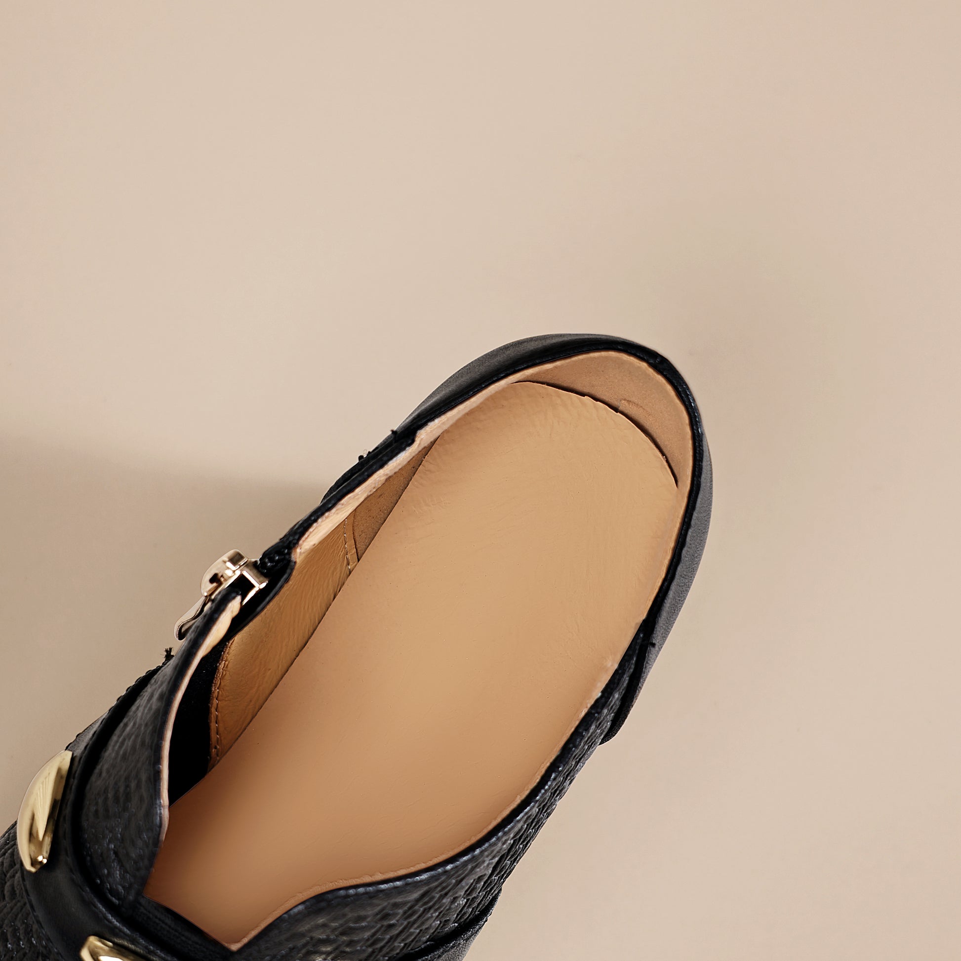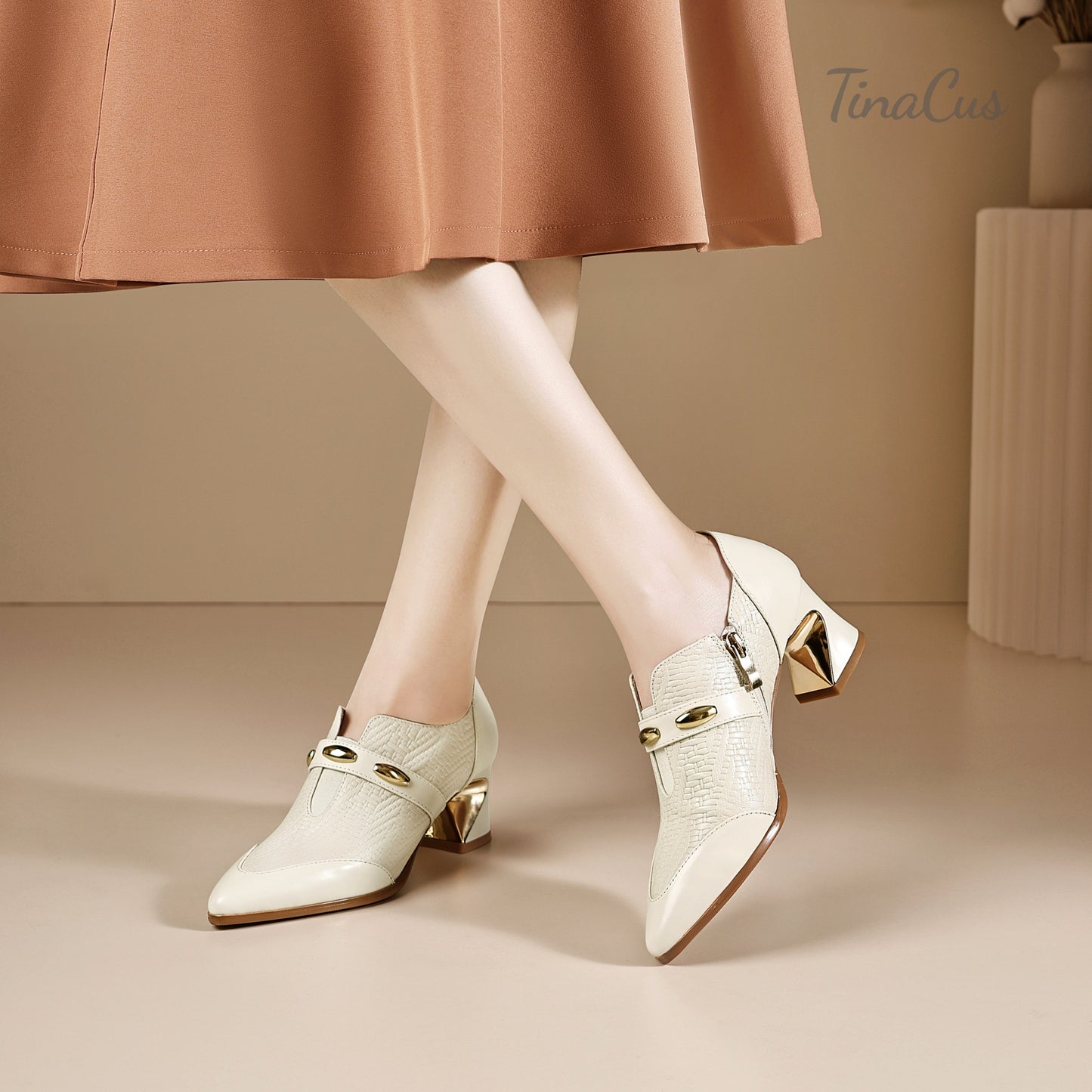 Pumps shoes designed with pointed toe, genuine leather, zipper and chunky heels to keep up with fashion trend