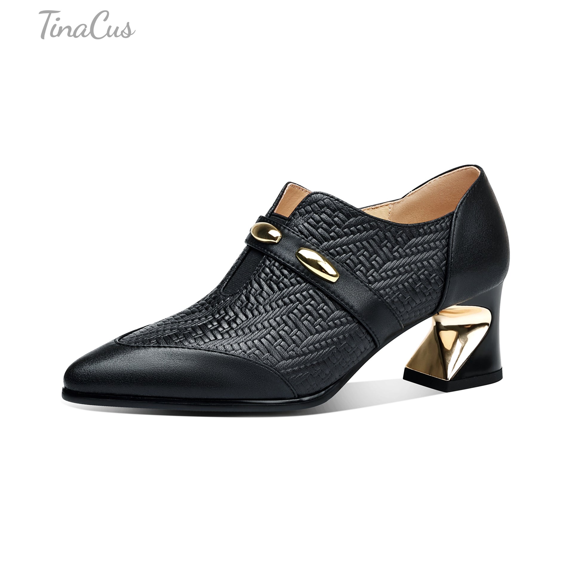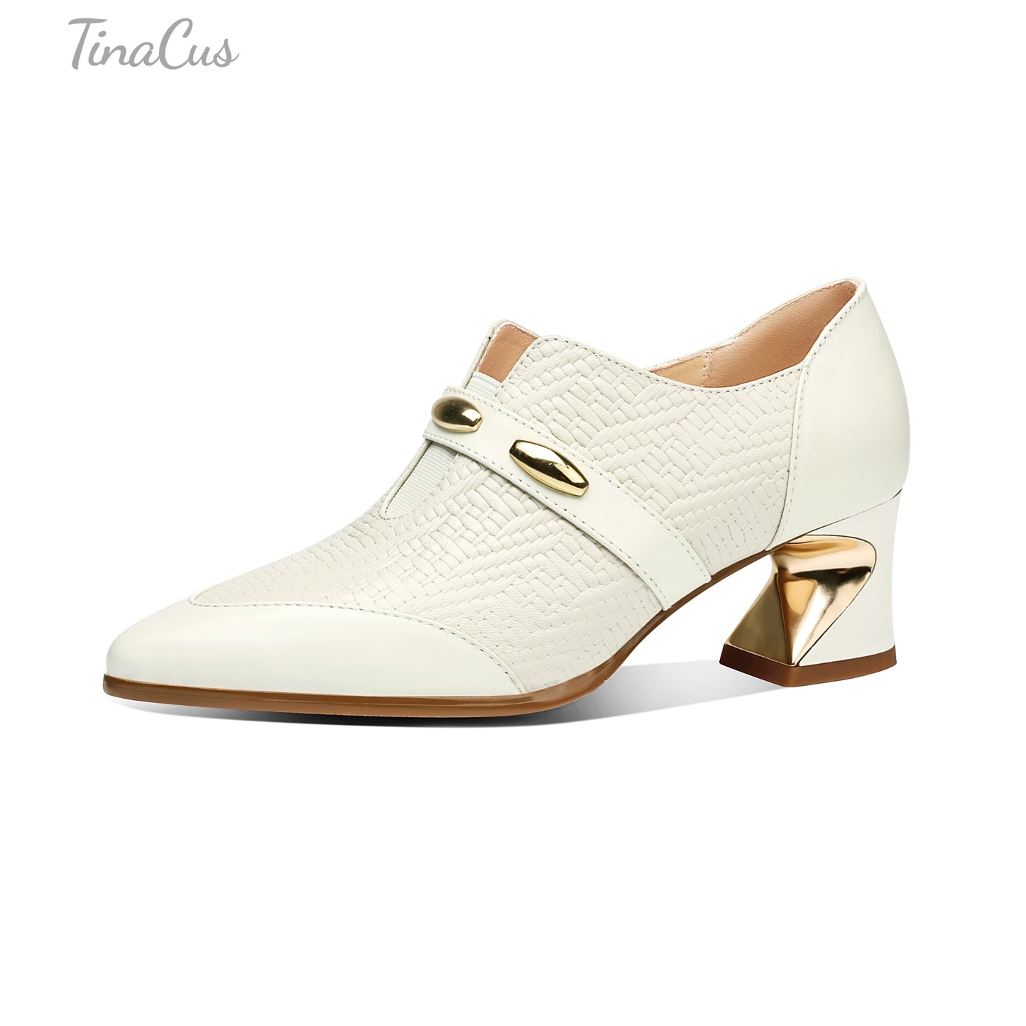 TinaCus Genuine Leather Handmade Chunky Heels Women's Pointed Toe Side Zip up Pumps Shoes