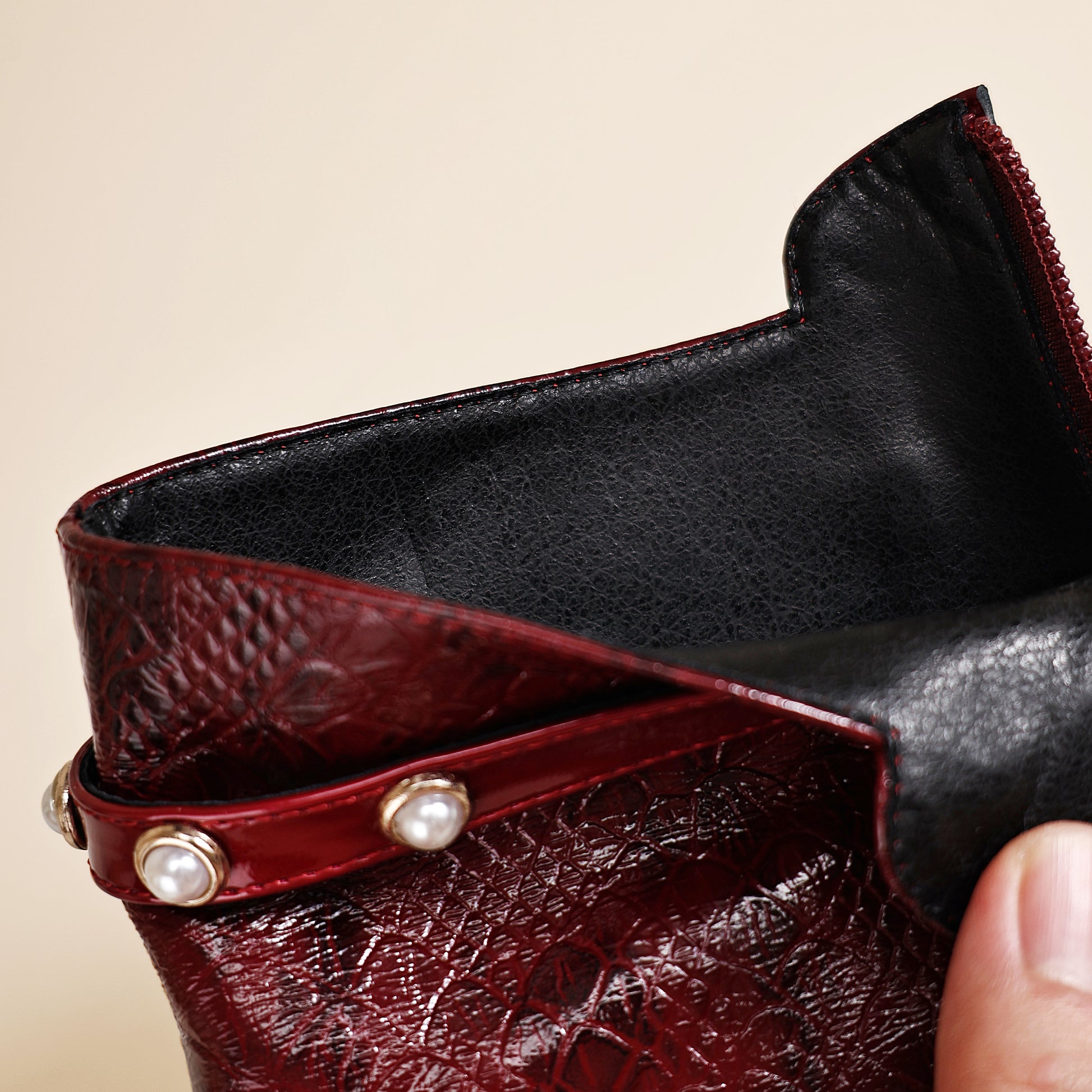TinaCus Genuine Leather Women's Pointed Toe Handmade Chunky Heels Zip up Ankle Boots with Pearls