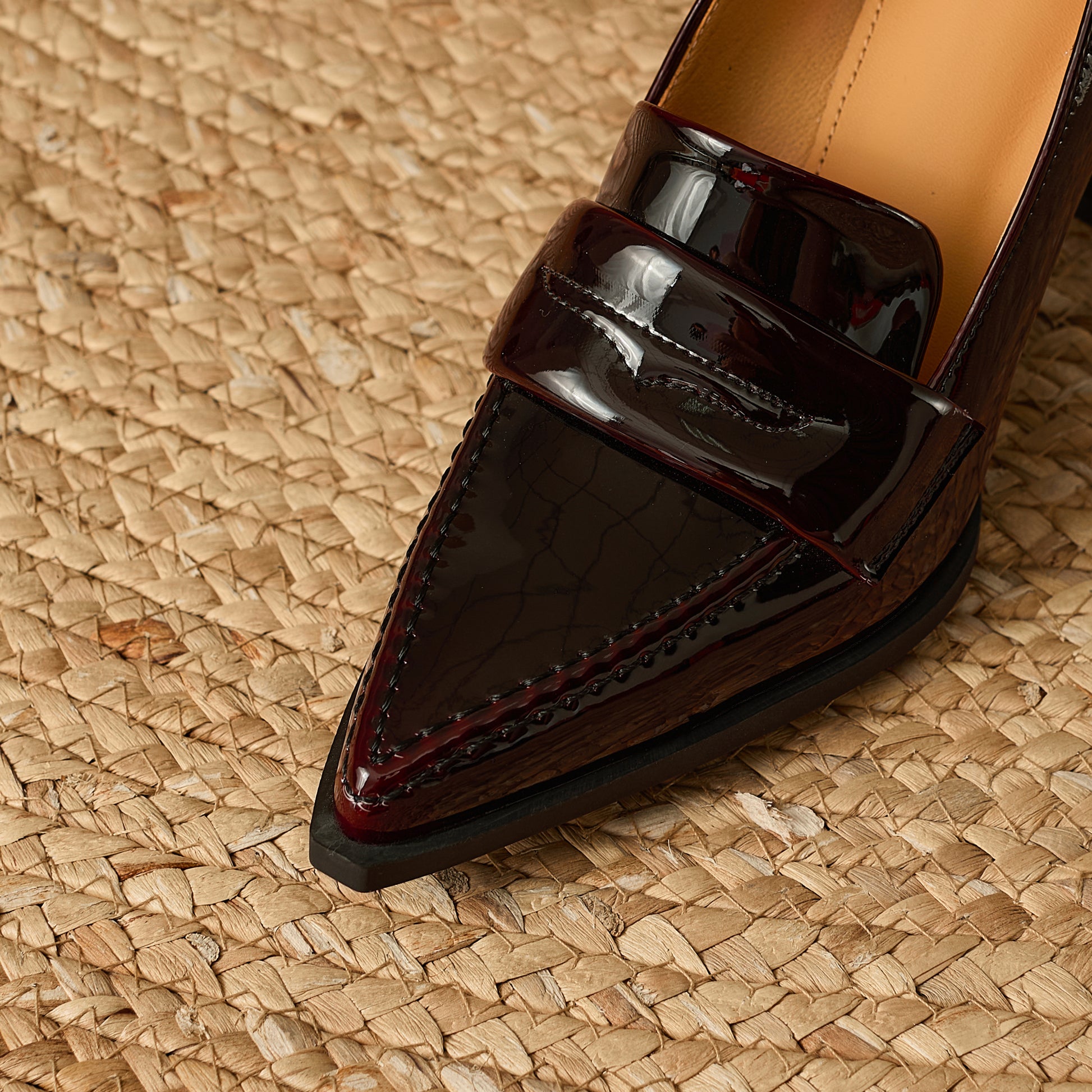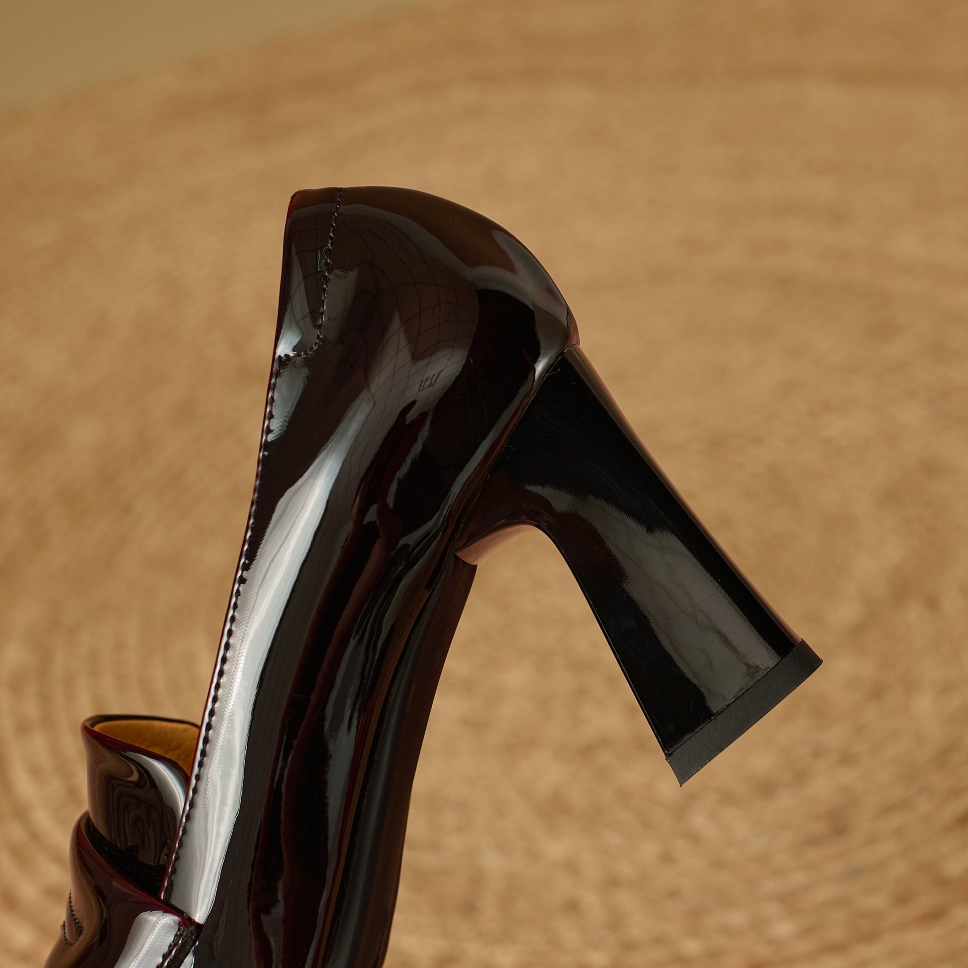 TinaCus Glossy Genuine Leather Women's Pointed Toe High Chunky Heels Slip on Pumps Shoes