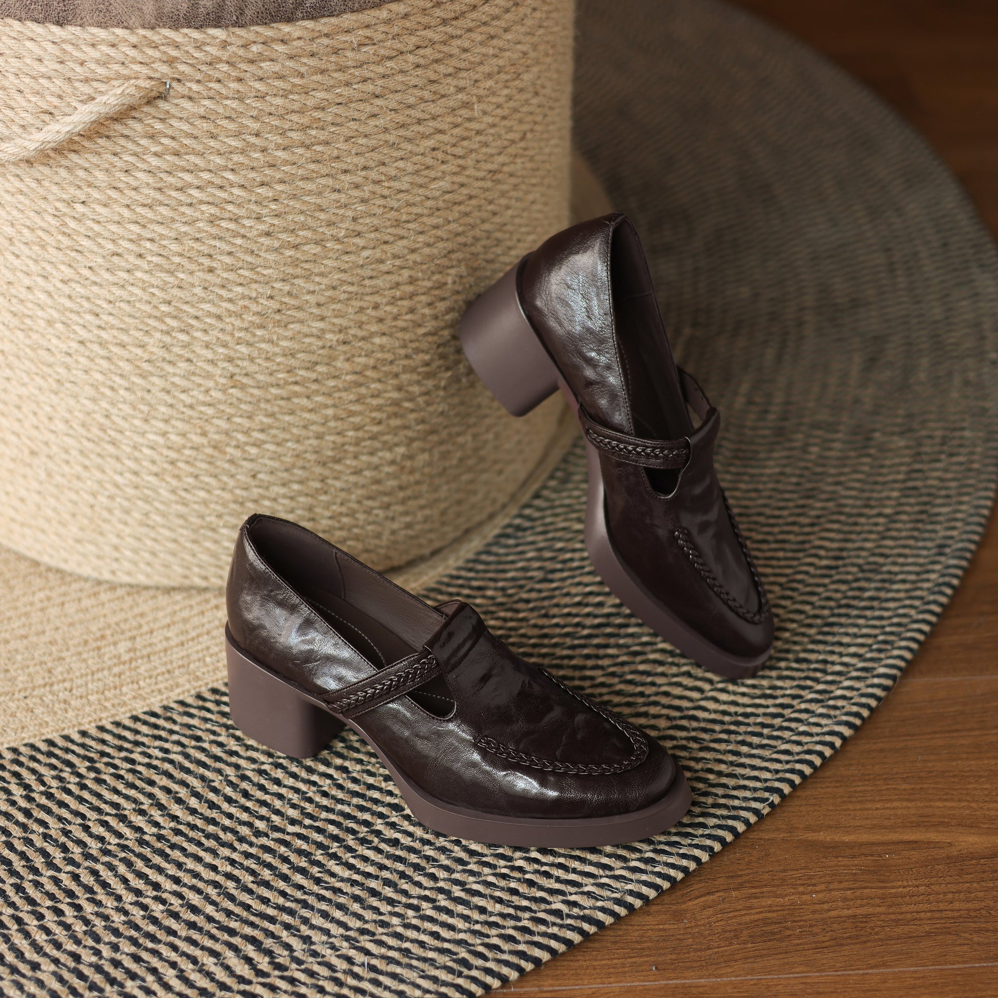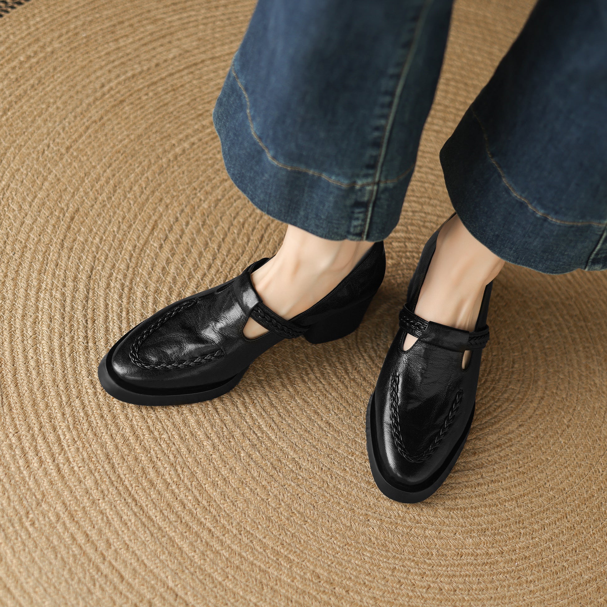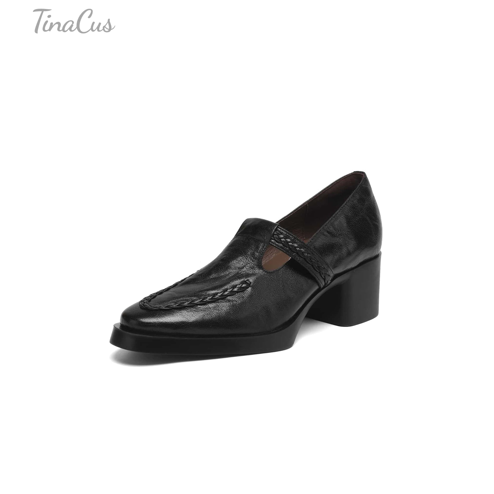 TinaCus Handmade Women's Genuine Leather Round Toe Braided T-Strap Stacked Heel Pump Shoes