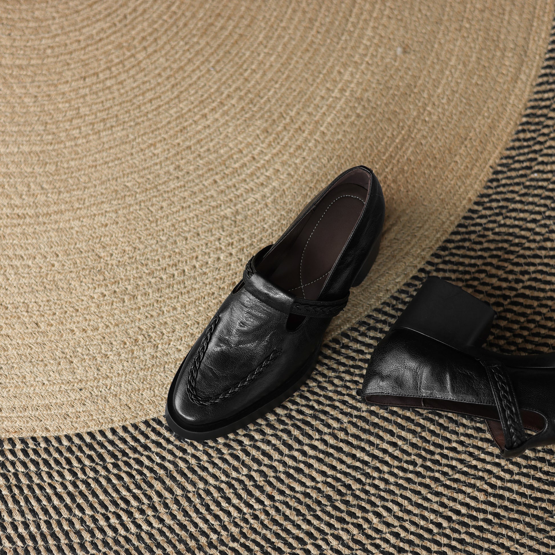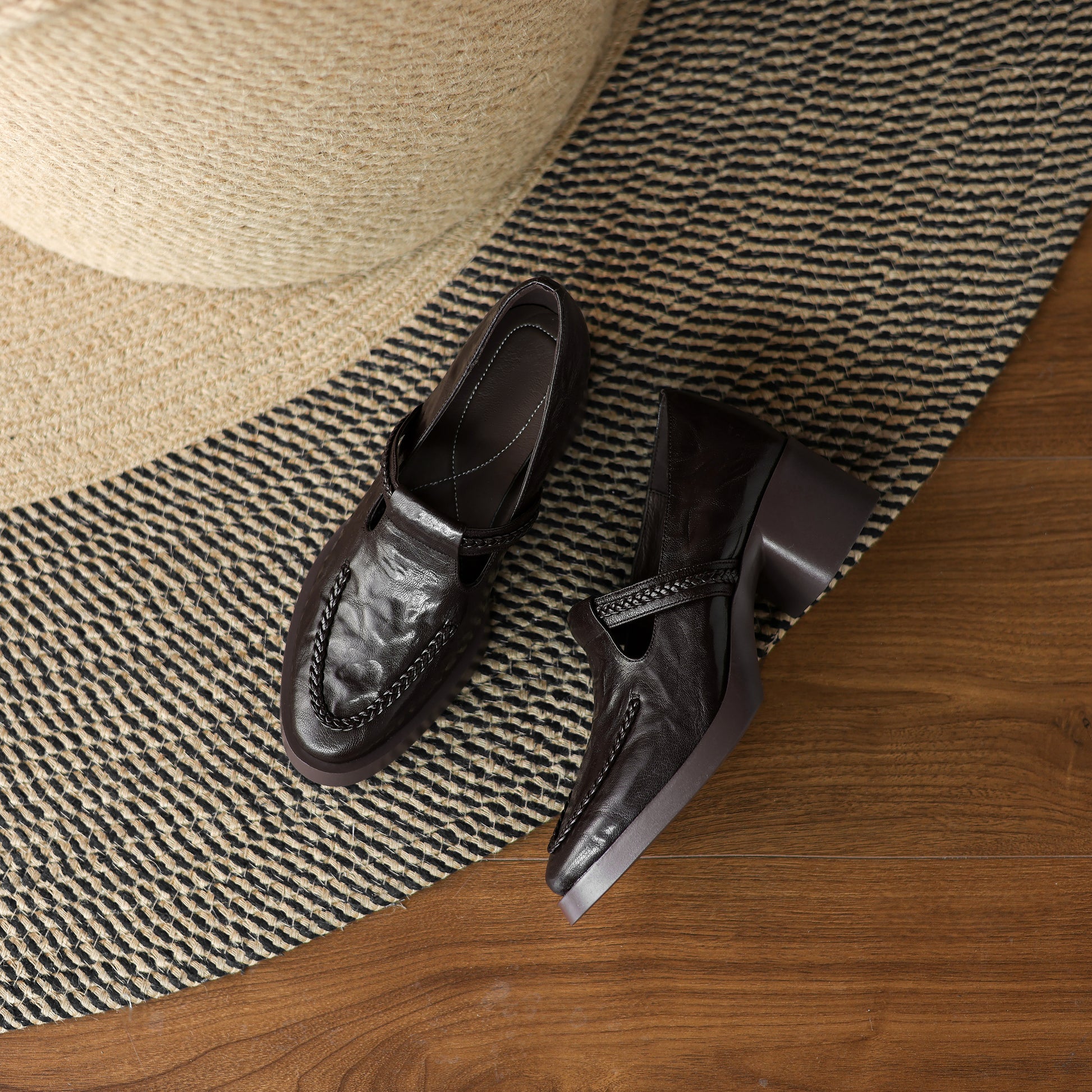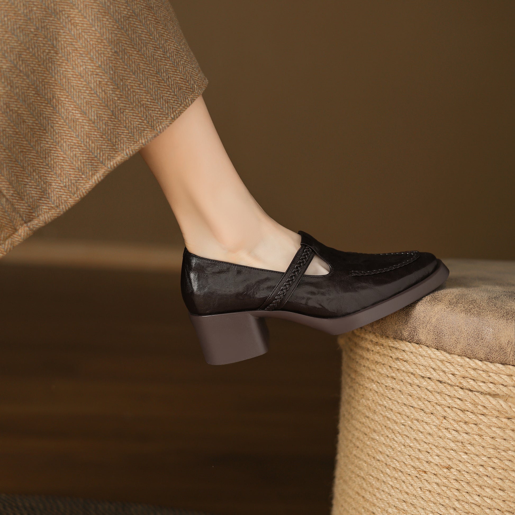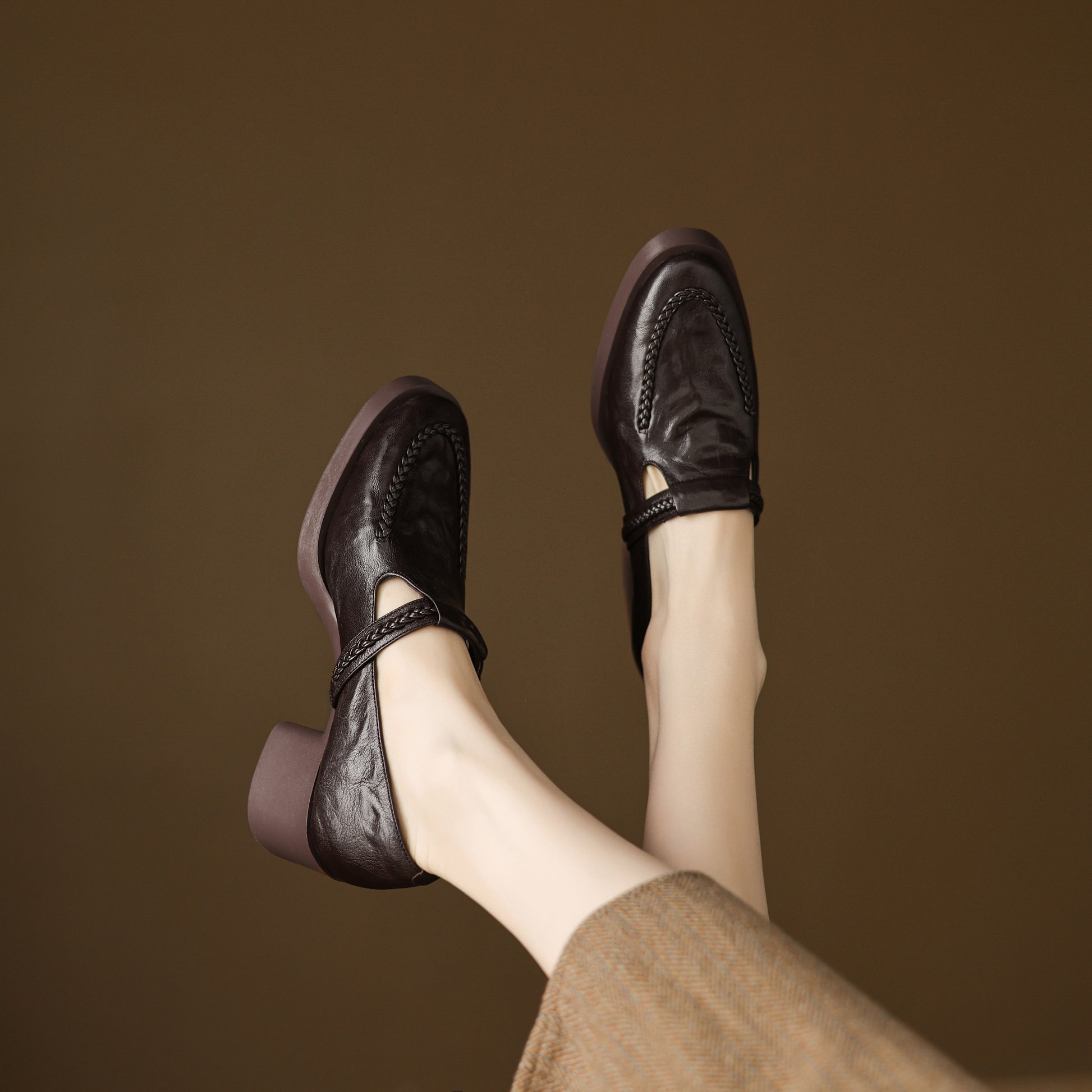 TinaCus Handmade Women's Genuine Leather Round Toe Braided T-Strap Stacked Heel Pump Shoes