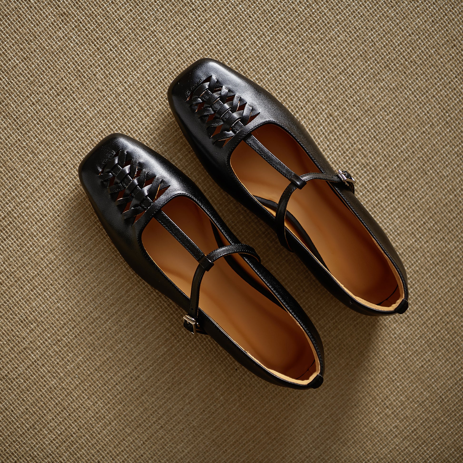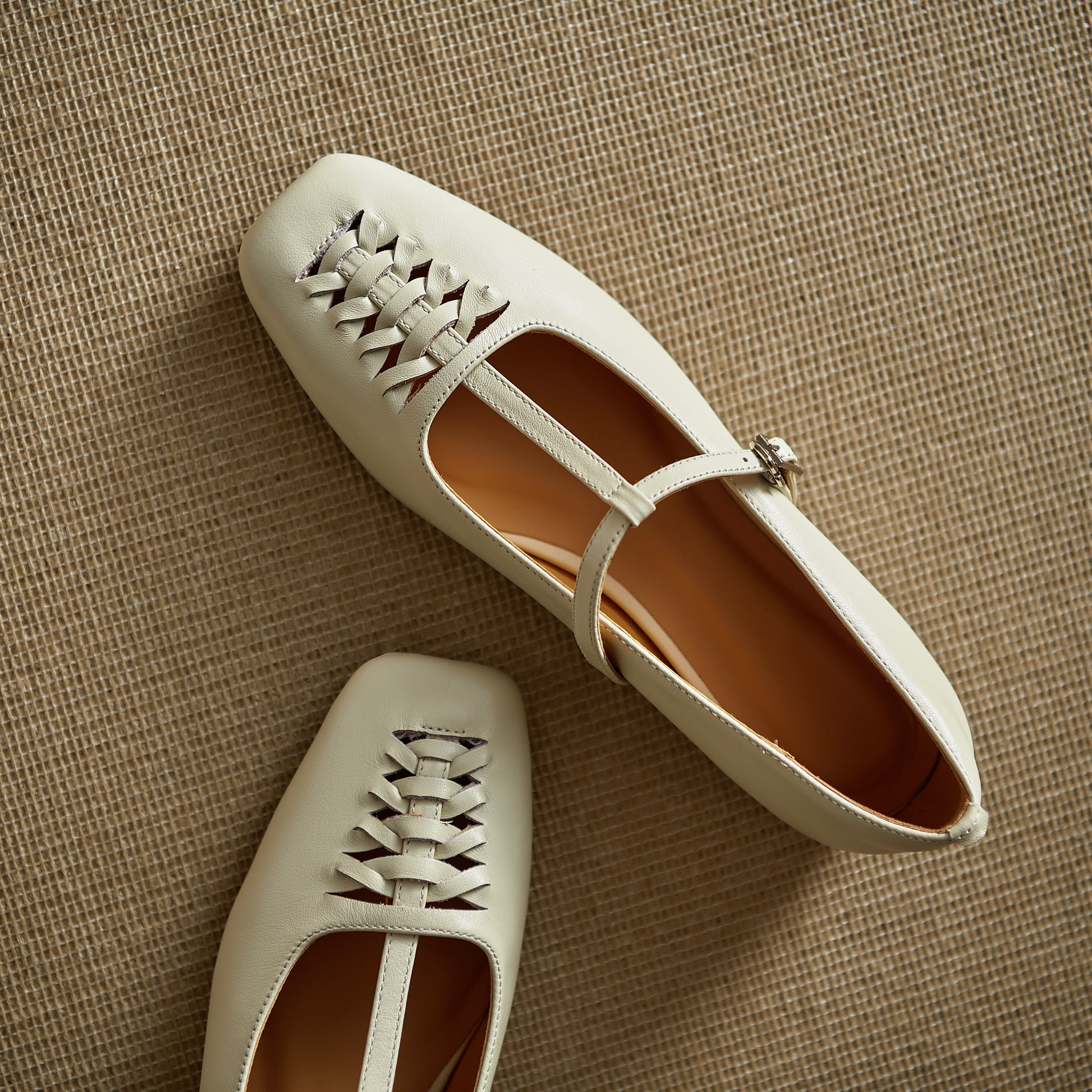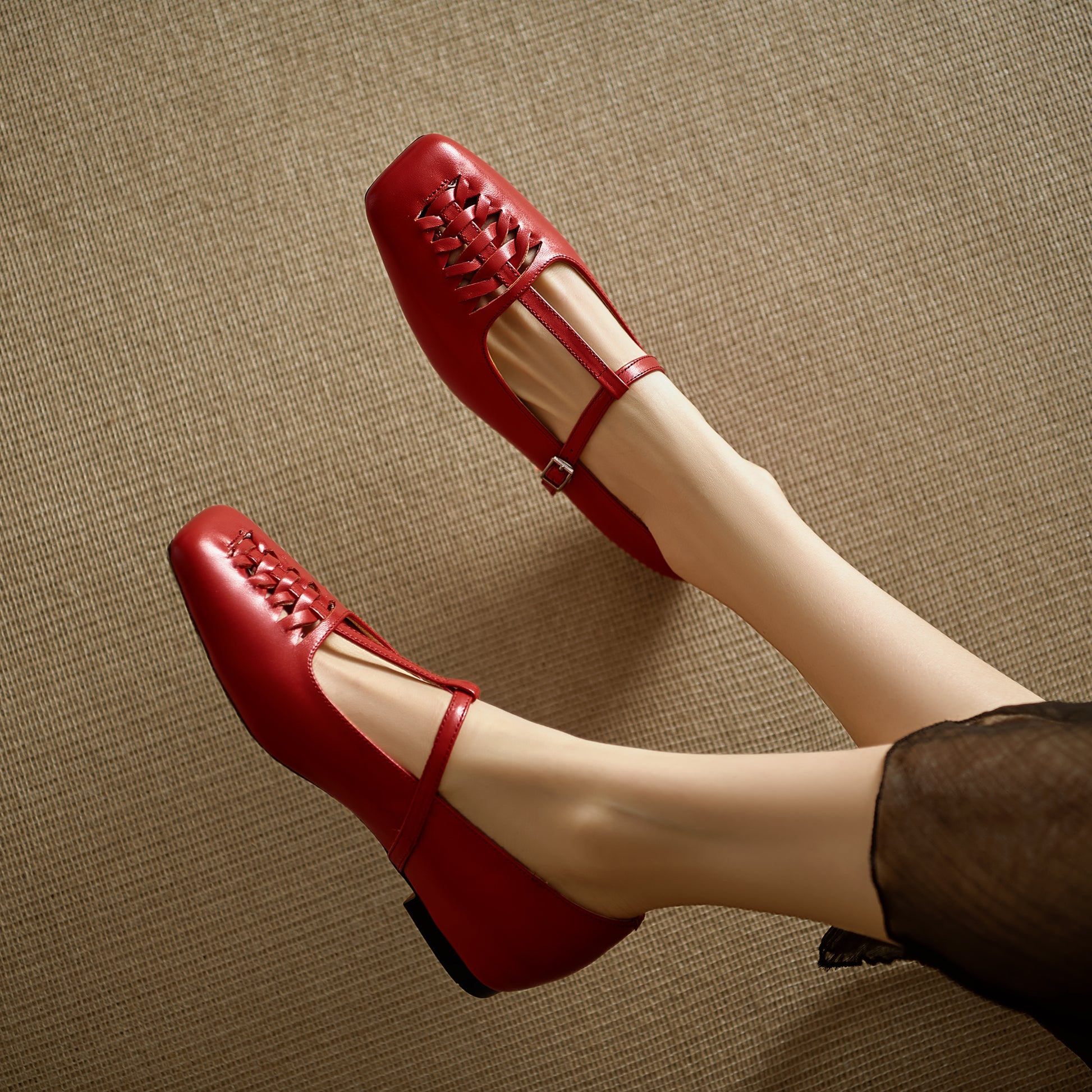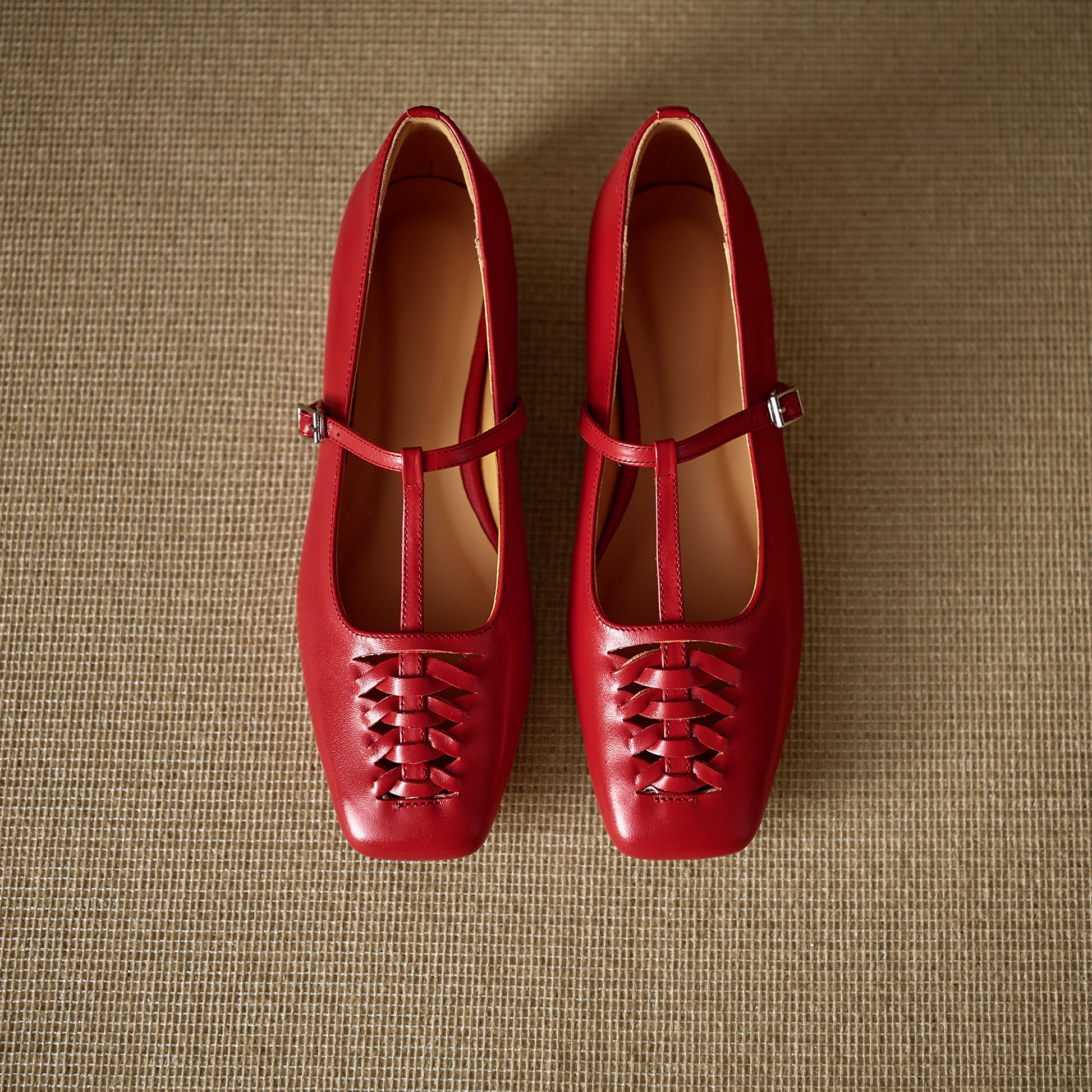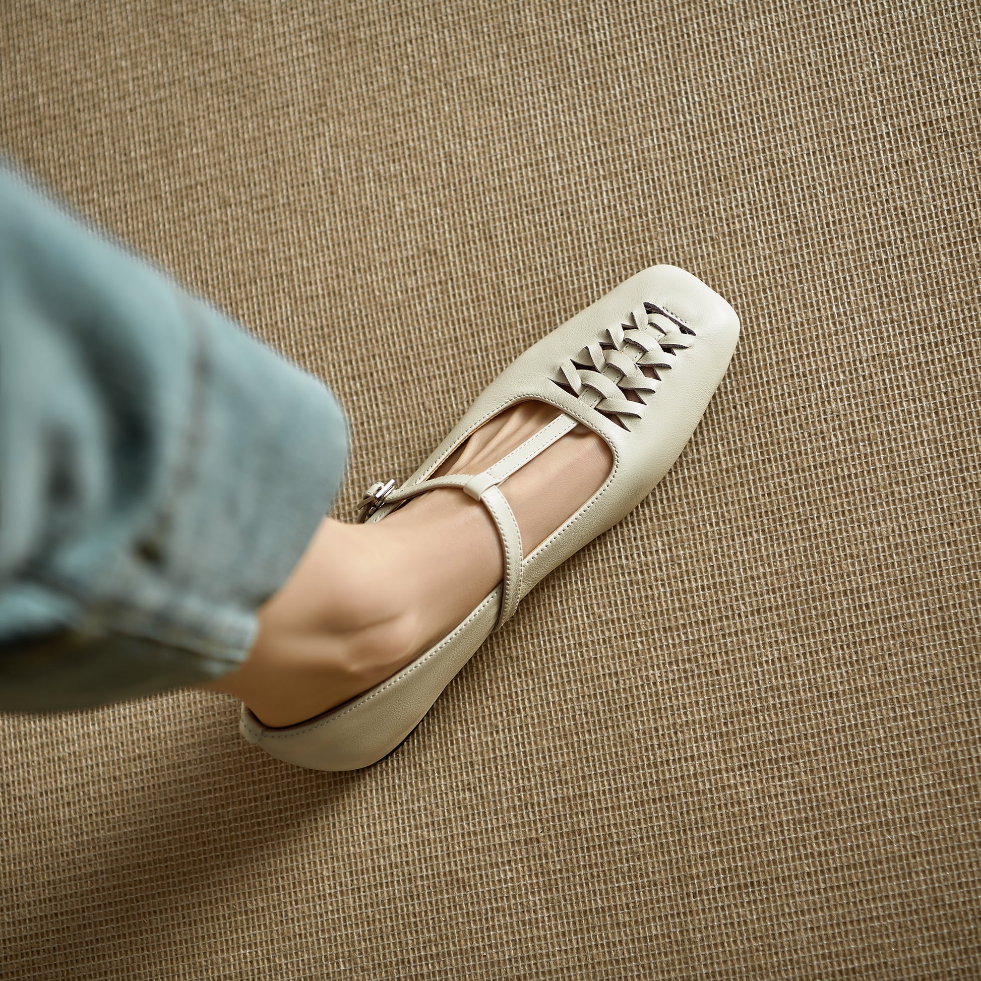 TinaCus Handmade Women's Genuine Leather Square Toe Hollow-out Woven T-strap Buckle Mary Jane Flats