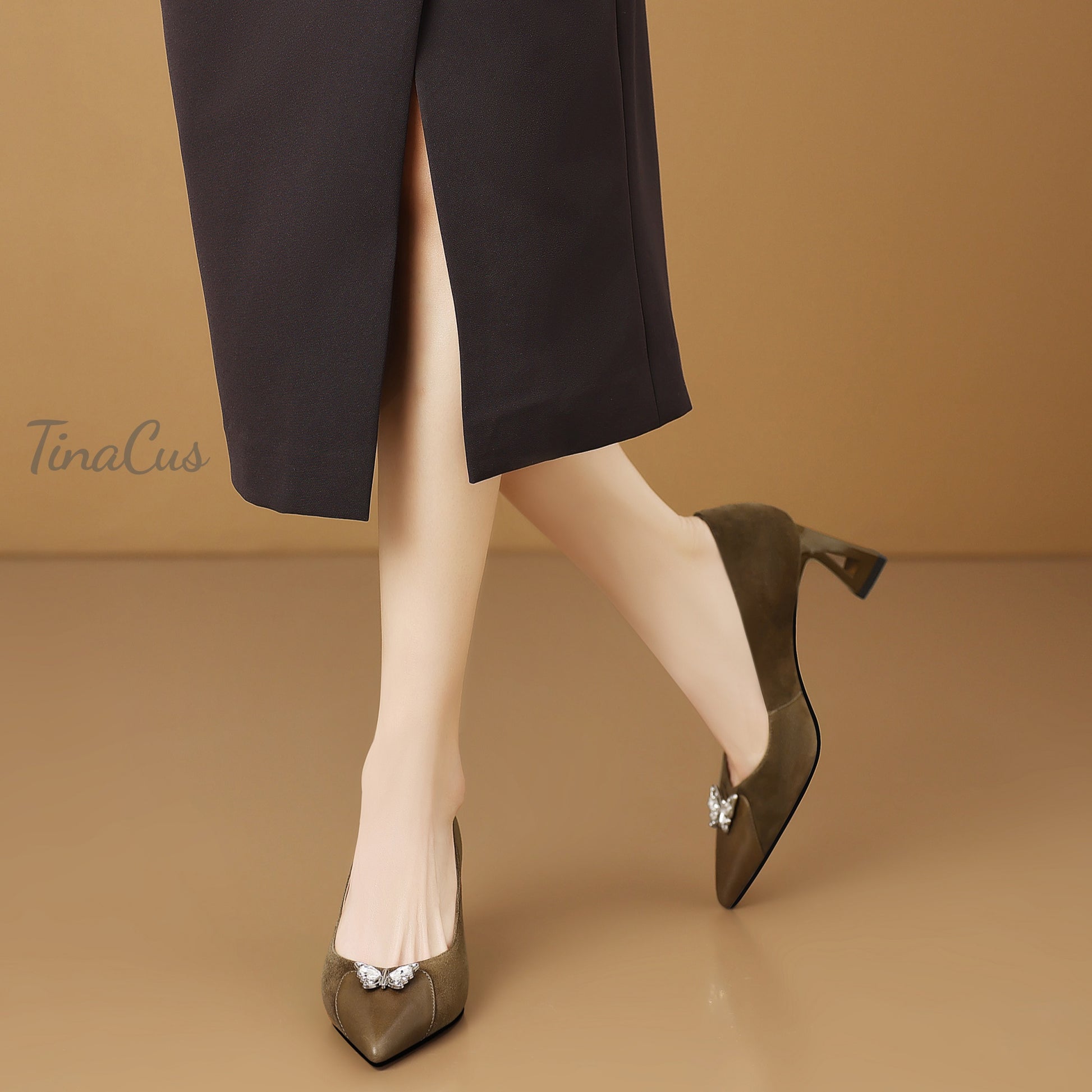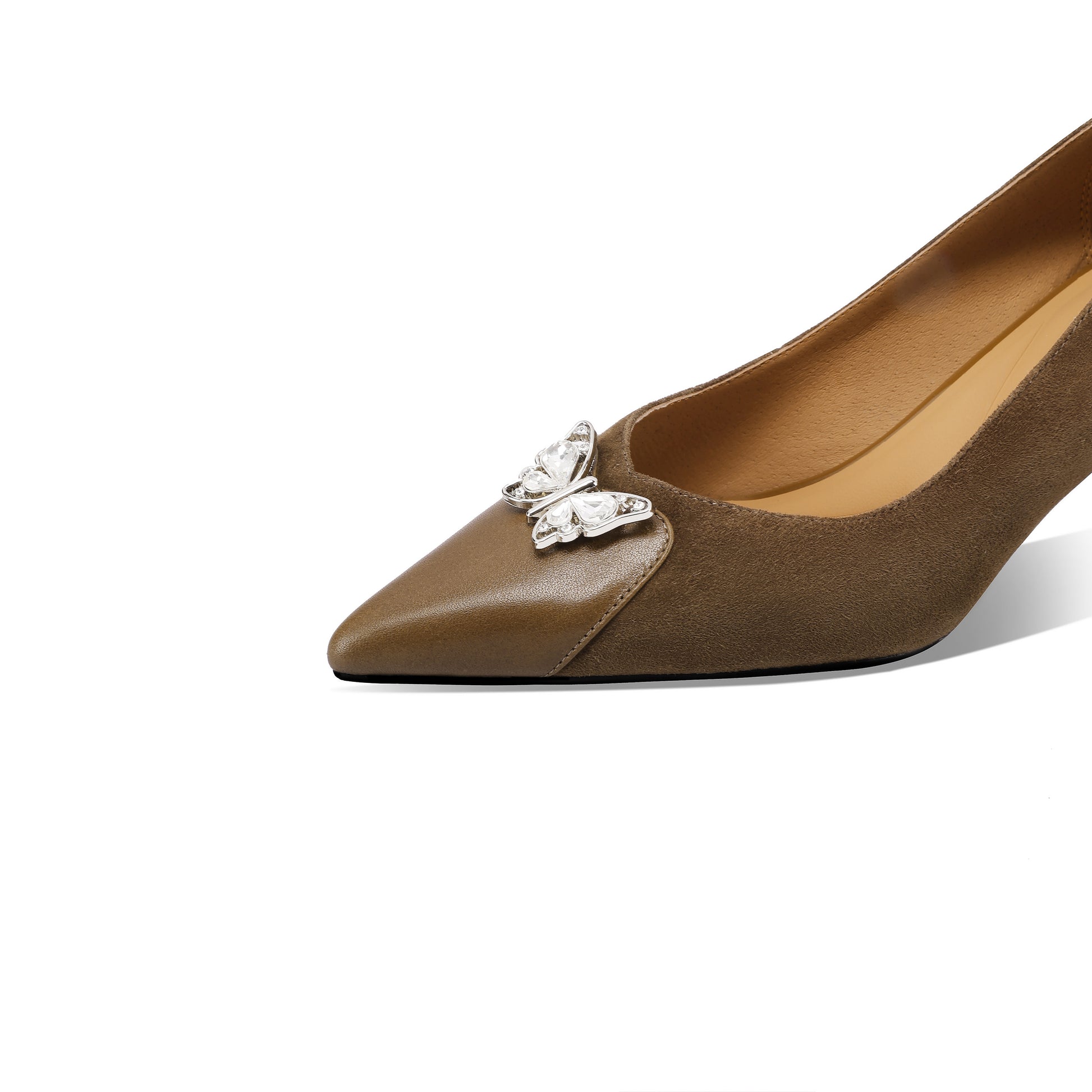 Pumps shoes designed with pointed toe, suede/genuine leather, butterfly and chunky heels to keep up with fashion trend