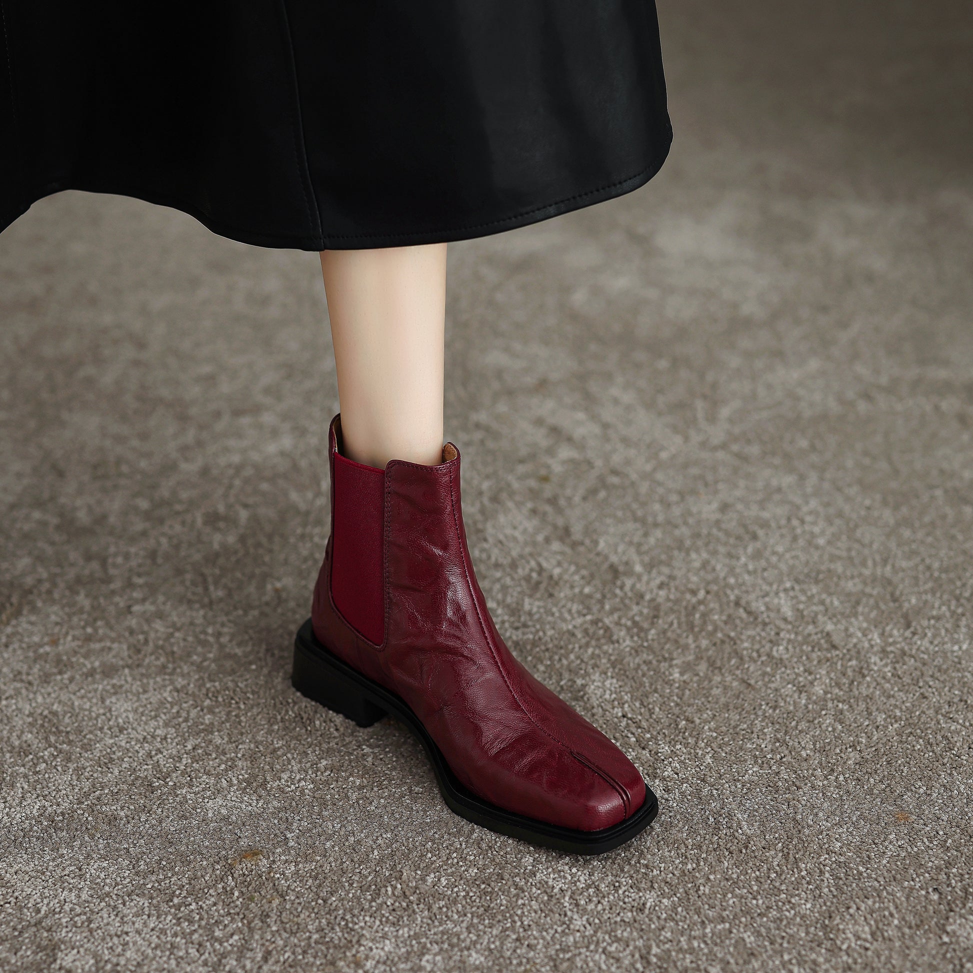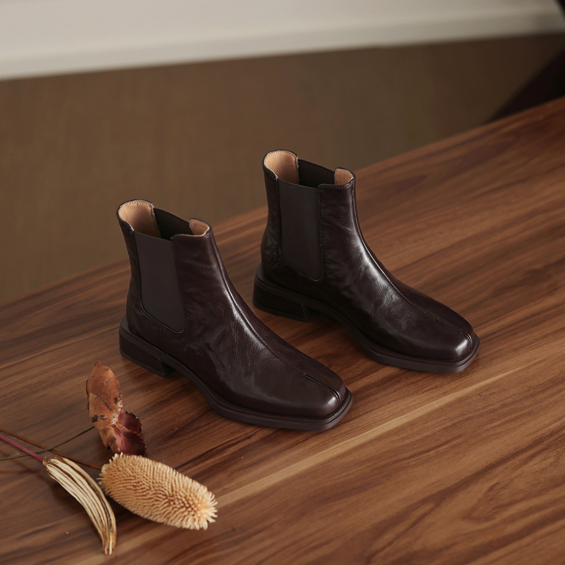 These leather Chelsea boots featuring a wrinkled texture, square toe, and slip-on design.