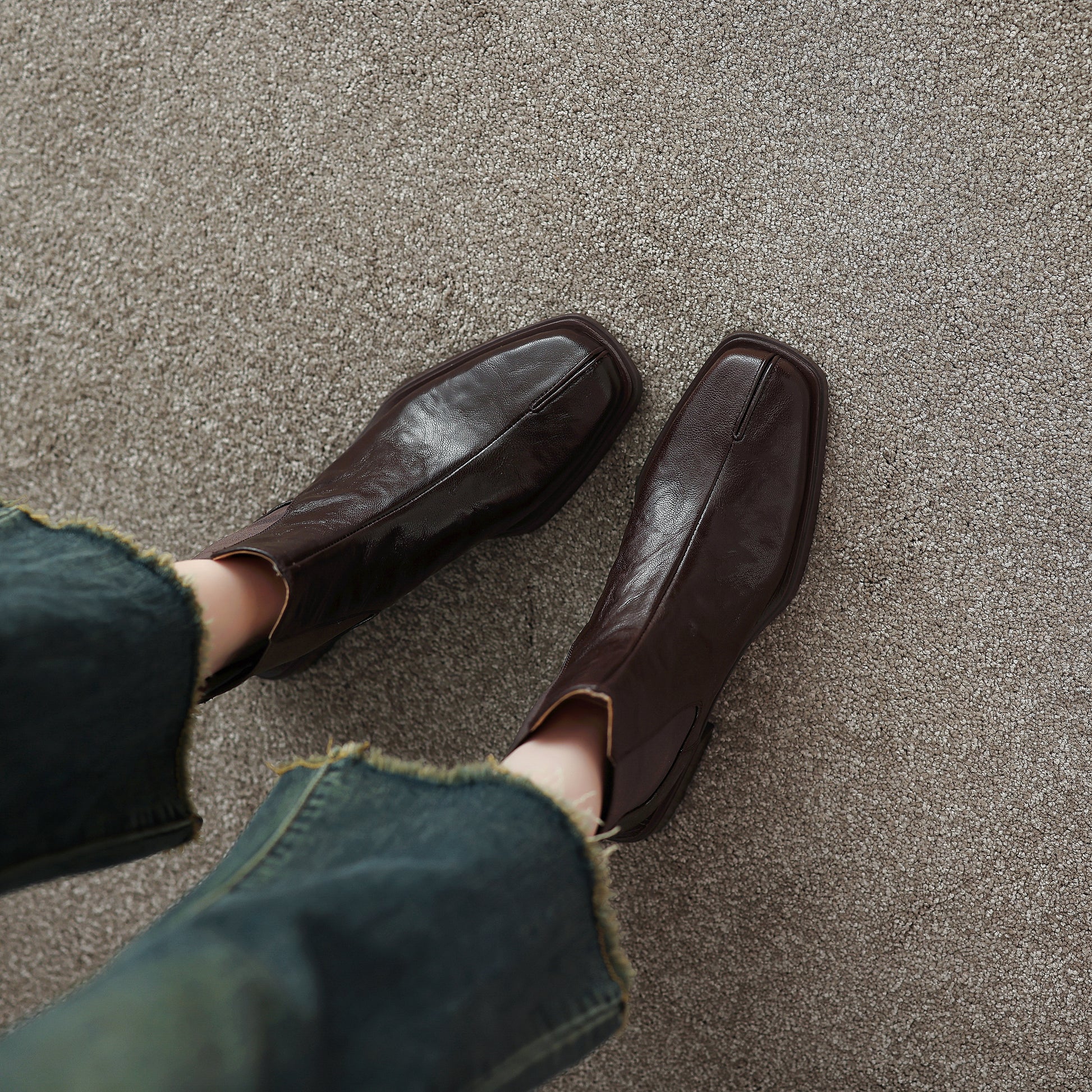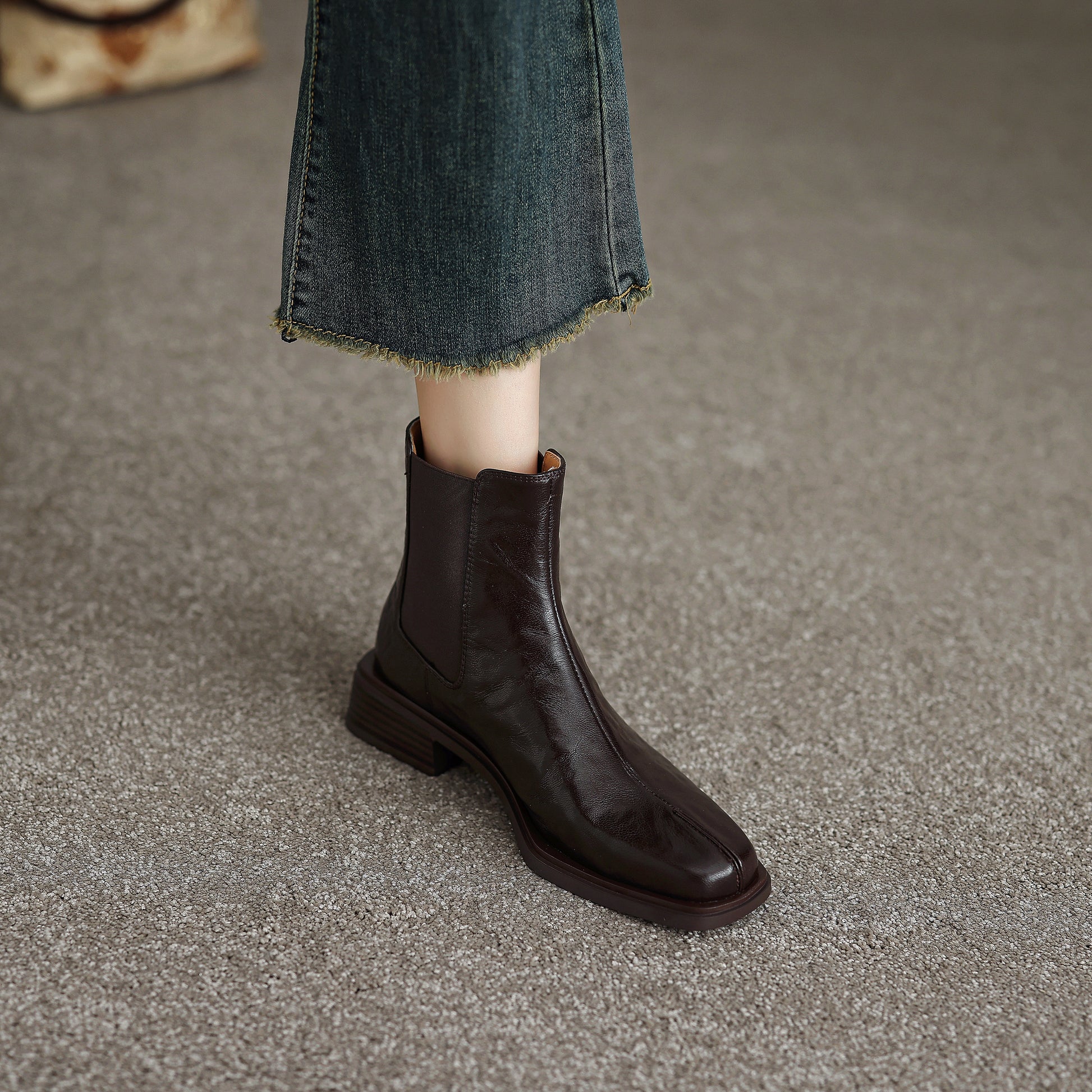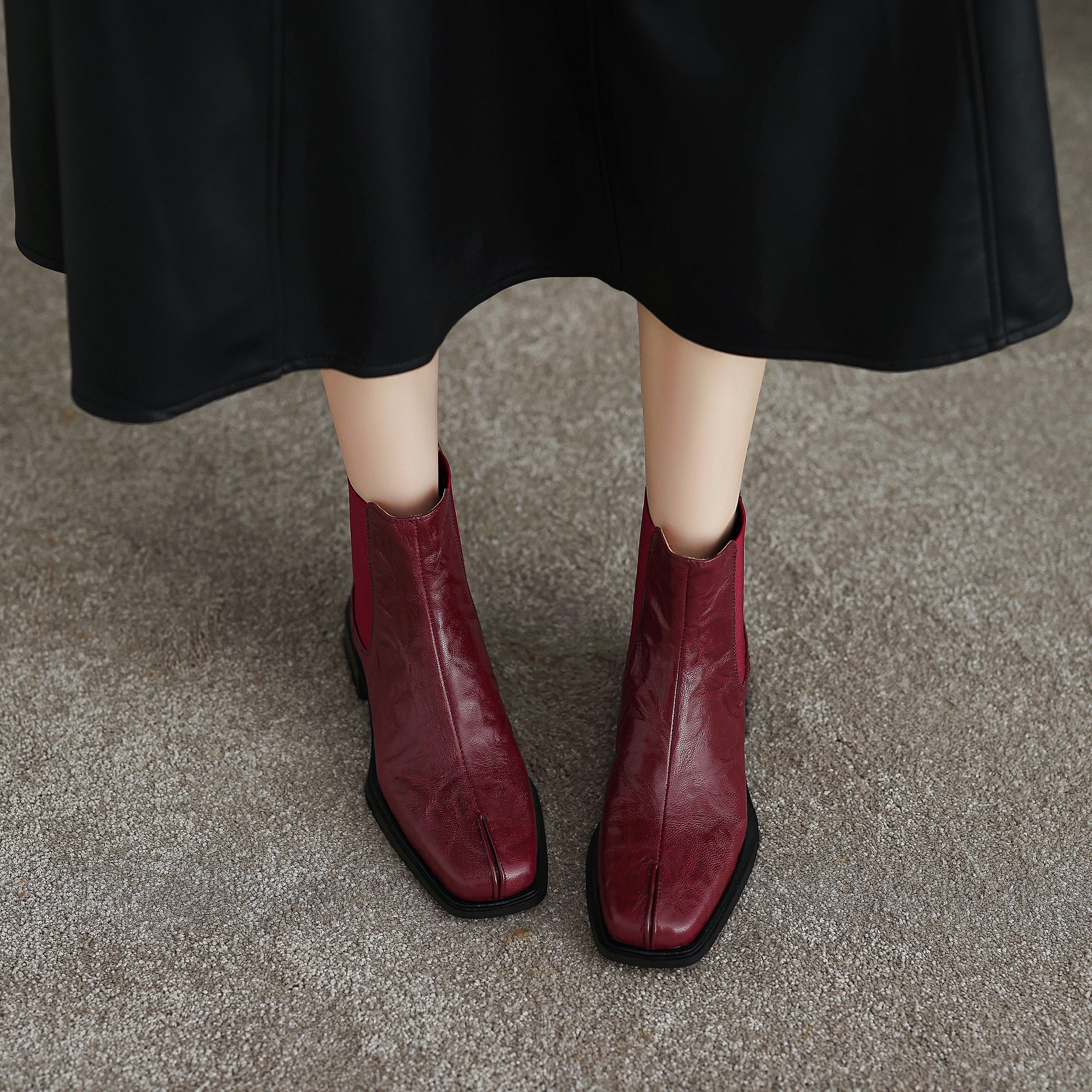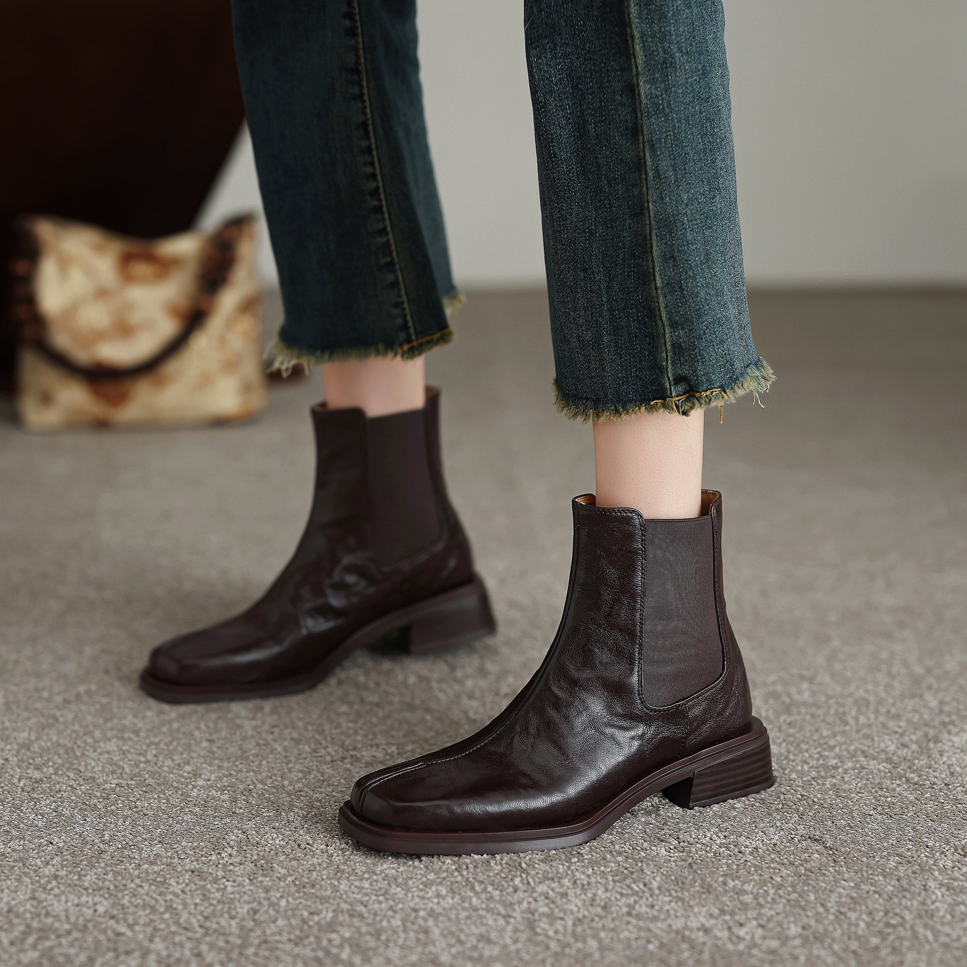 TinaCus Women's Chelsea Booties Handmade Genuine Leather Elastic Panel Square Toe Chunky Heel