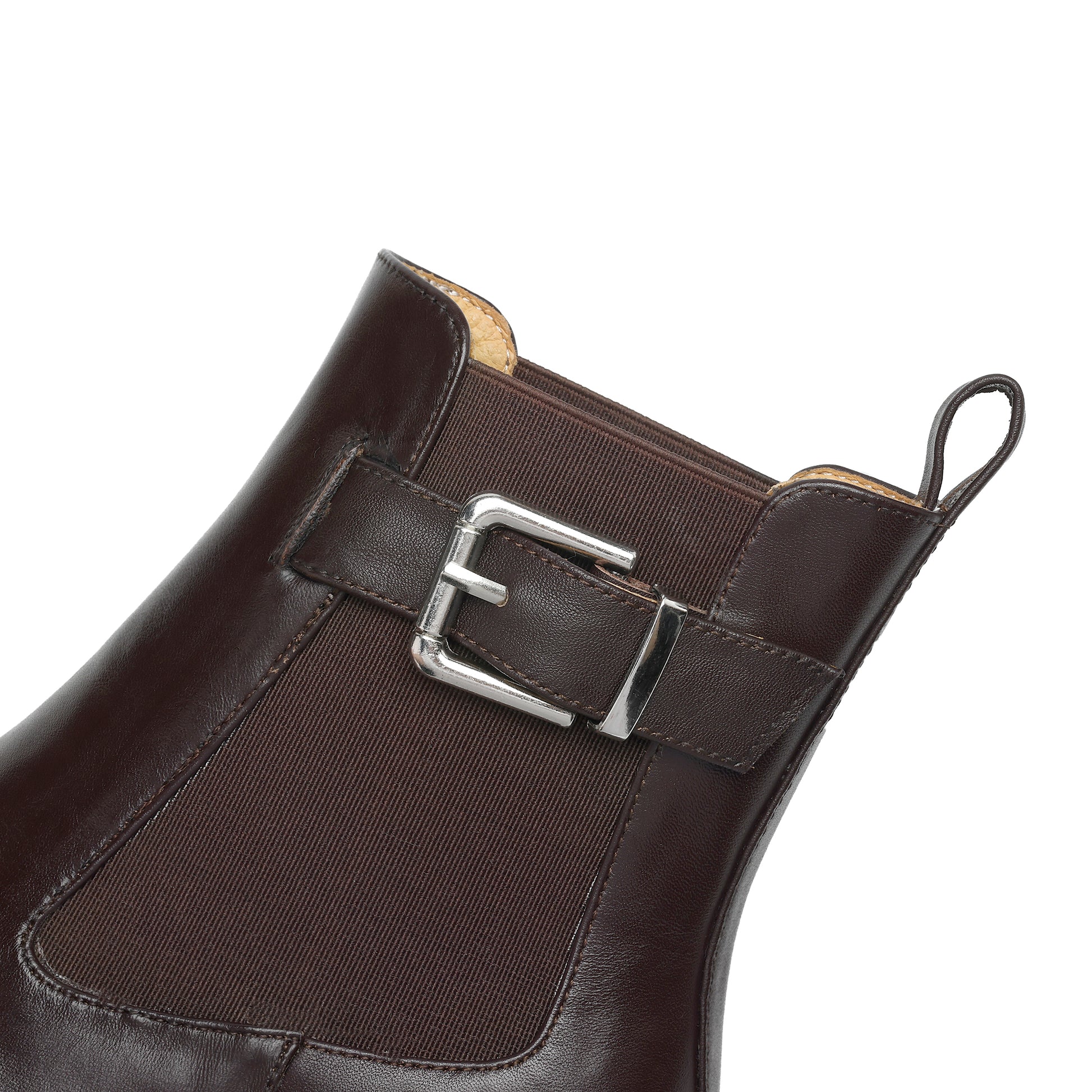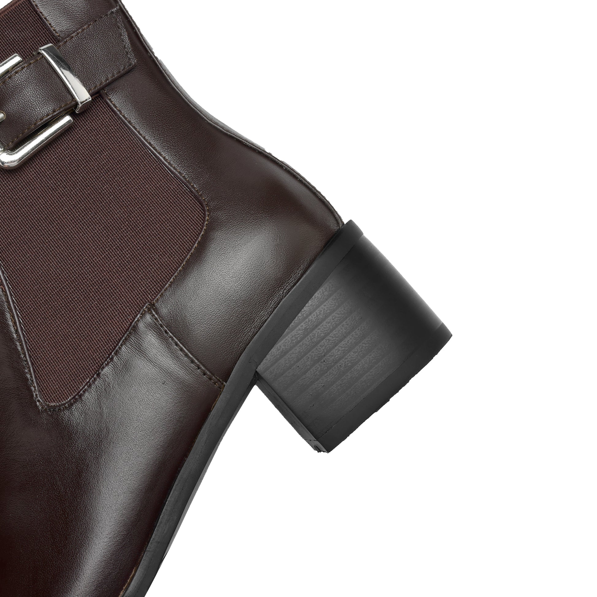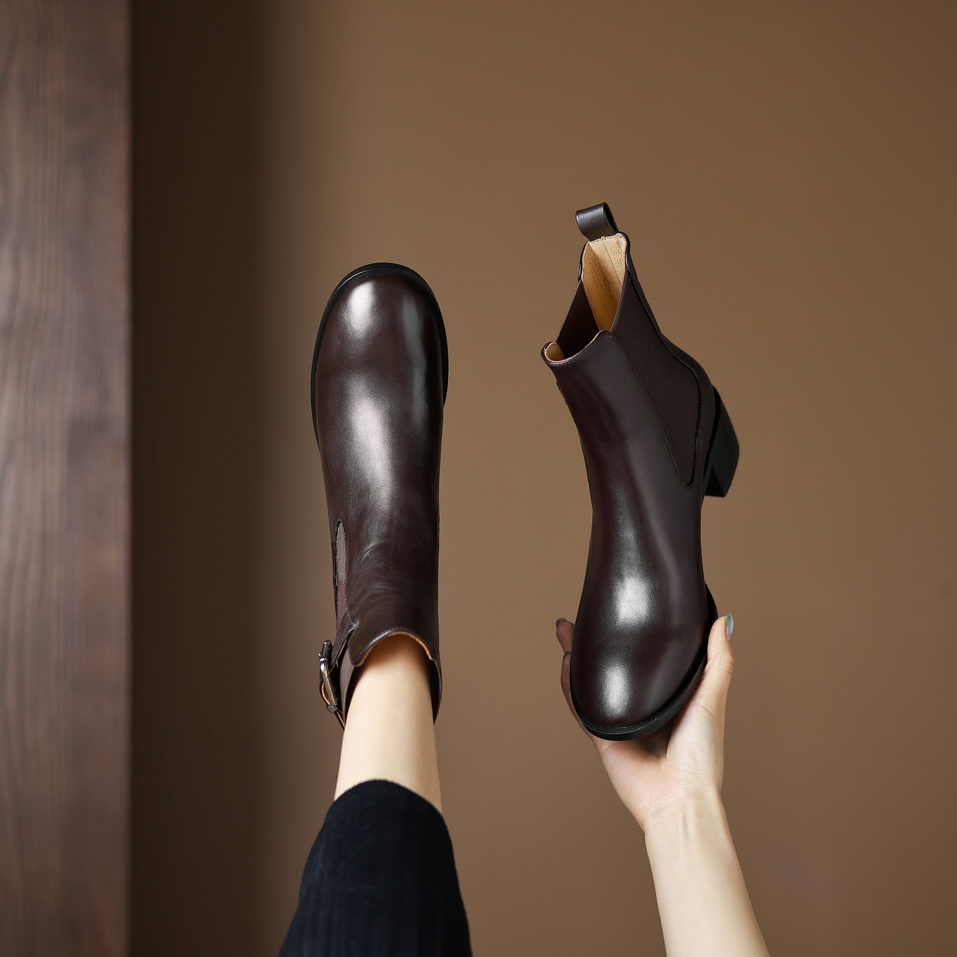 TinaCus Women's Genuine Leather Handmade Elastic Panel Ankle Buckle Round Toe Stacked Low Heel Short Booties