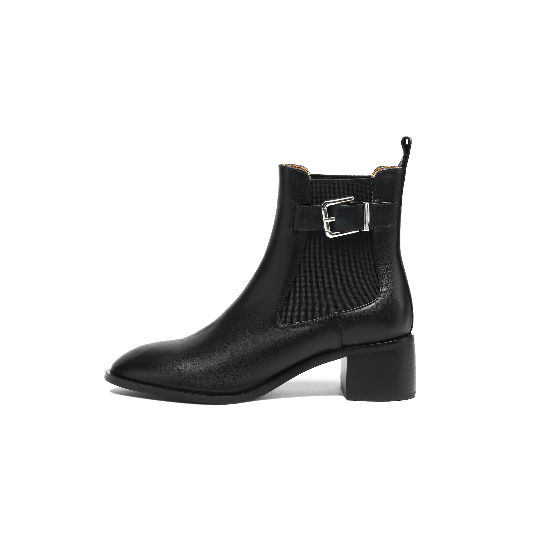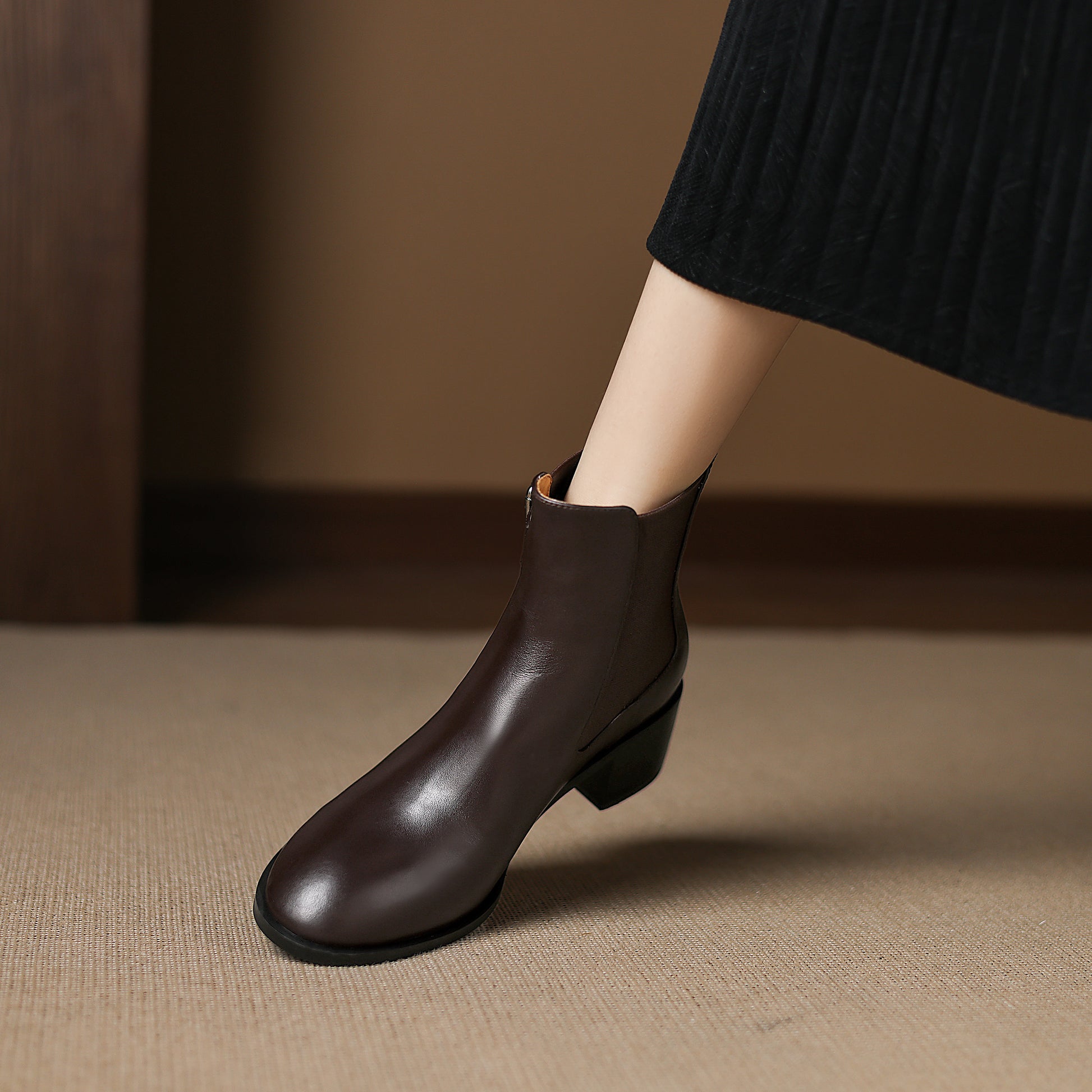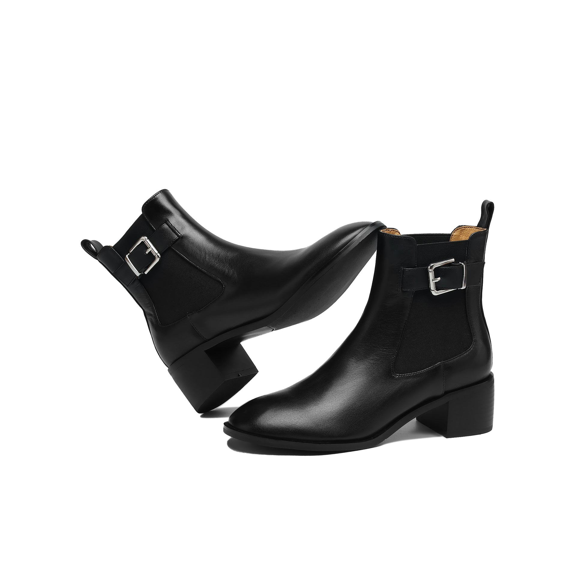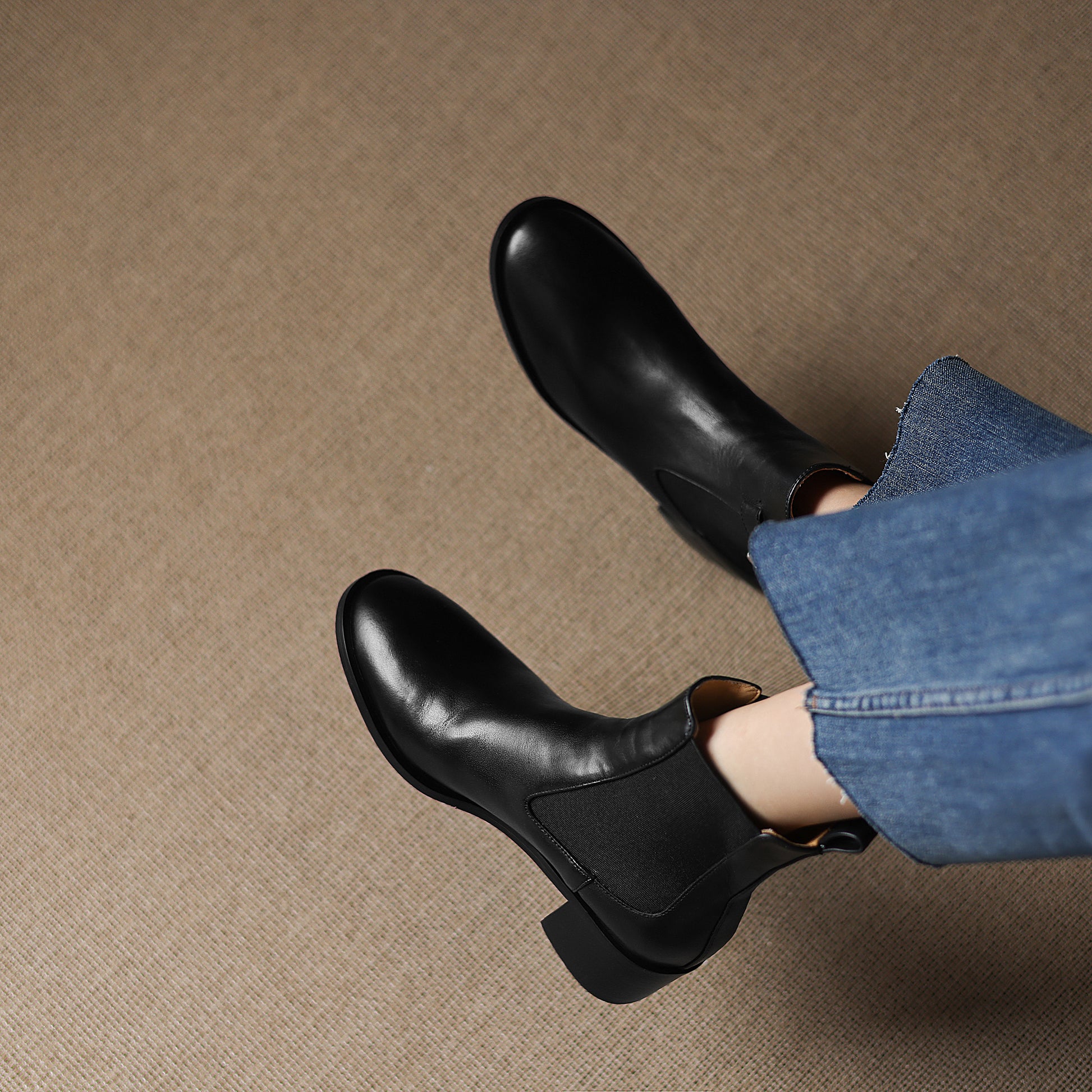 TinaCus Women's Genuine Leather Handmade Elastic Panel Ankle Buckle Round Toe Stacked Low Heel Short Booties