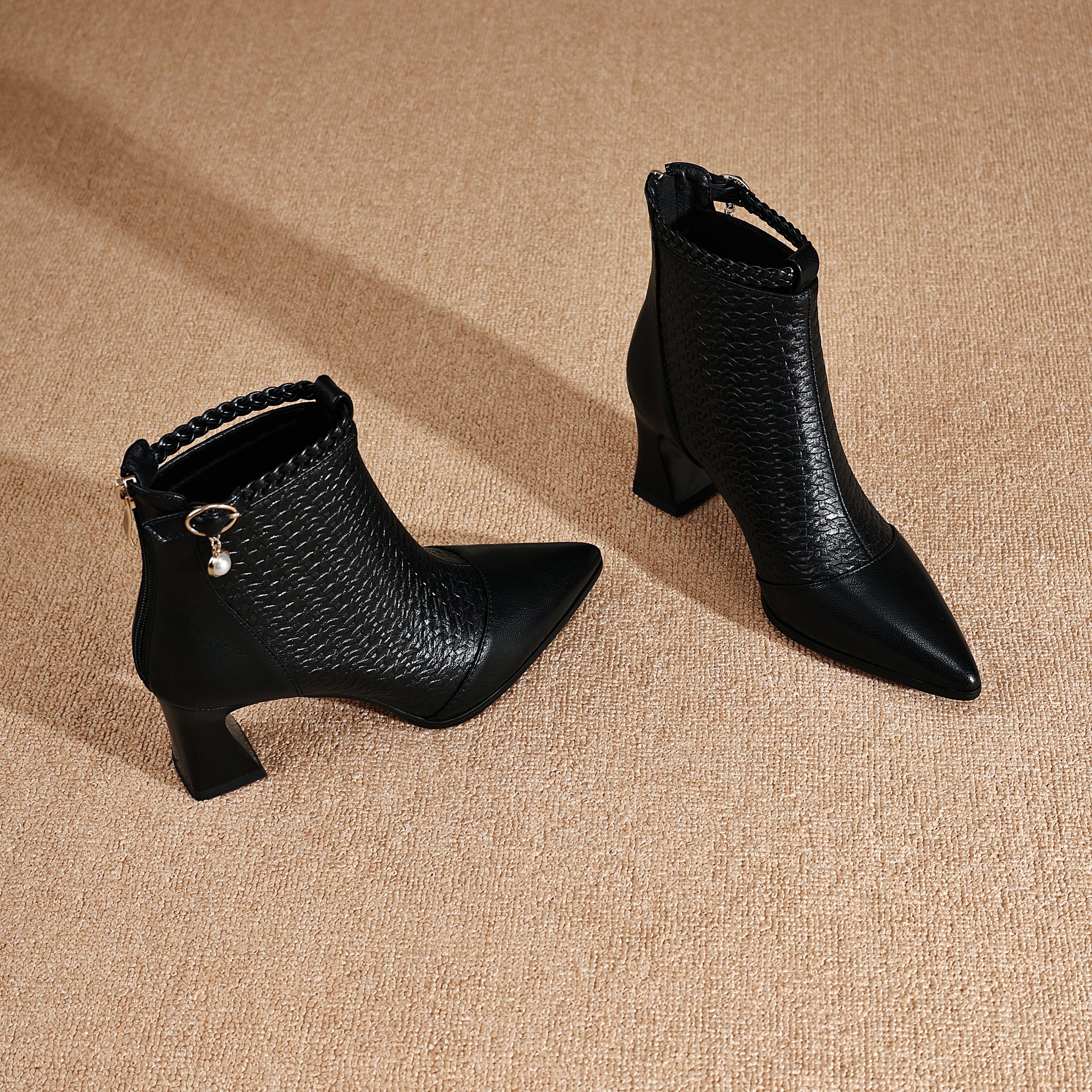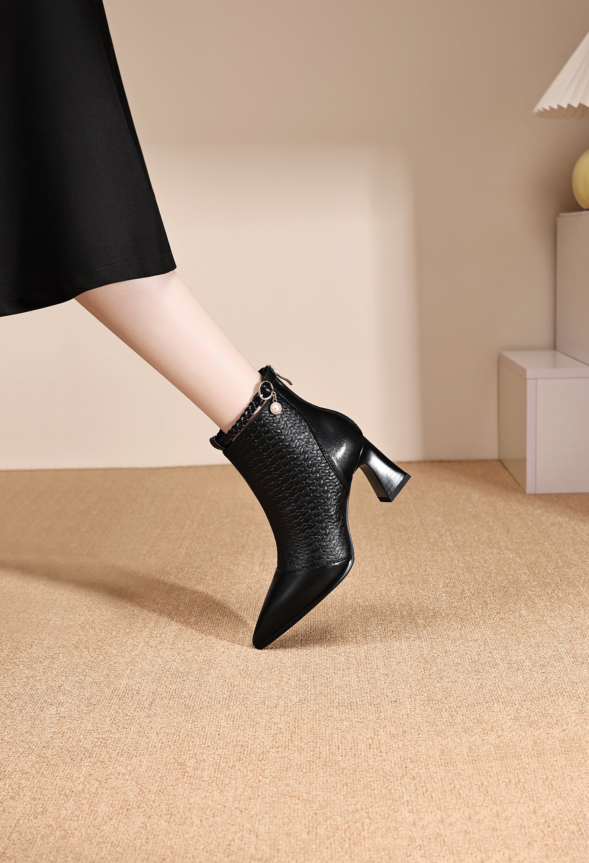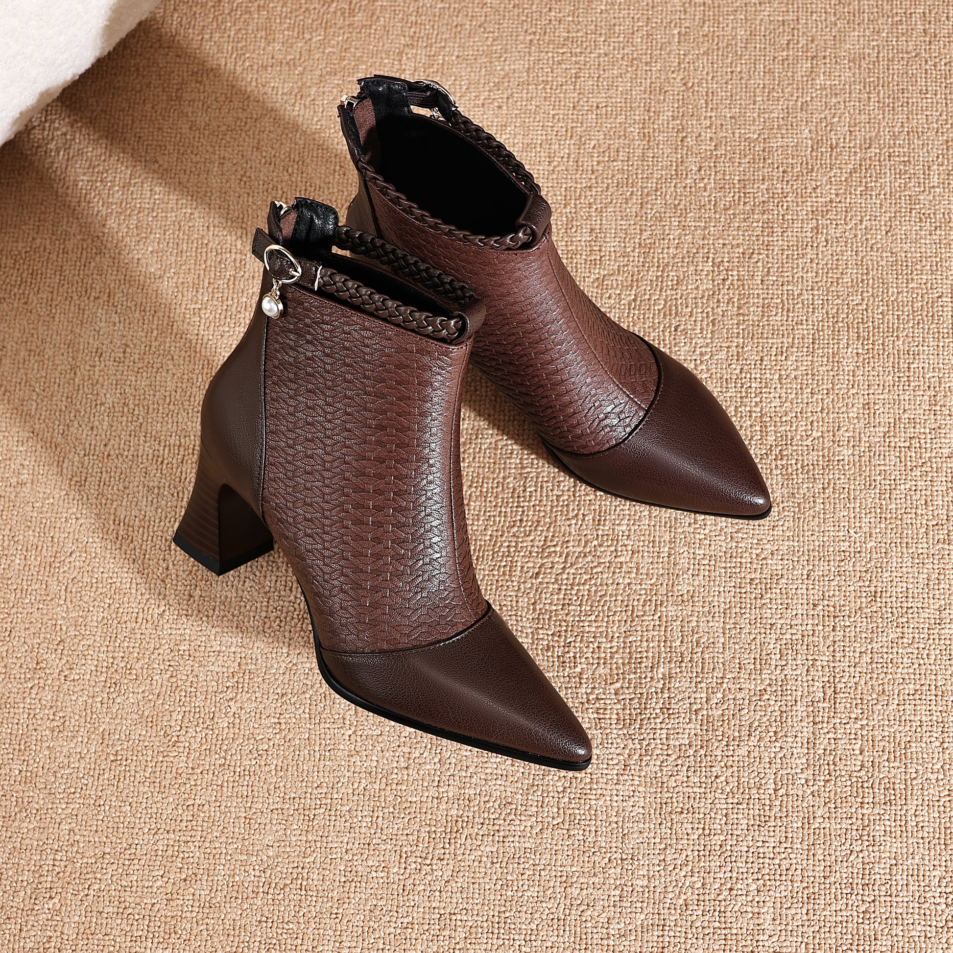 TinaCus Women's Genuine Leather Handmade Embossed Ankle Pendant Pointed Toe Spool Low Heel Ankle Booties