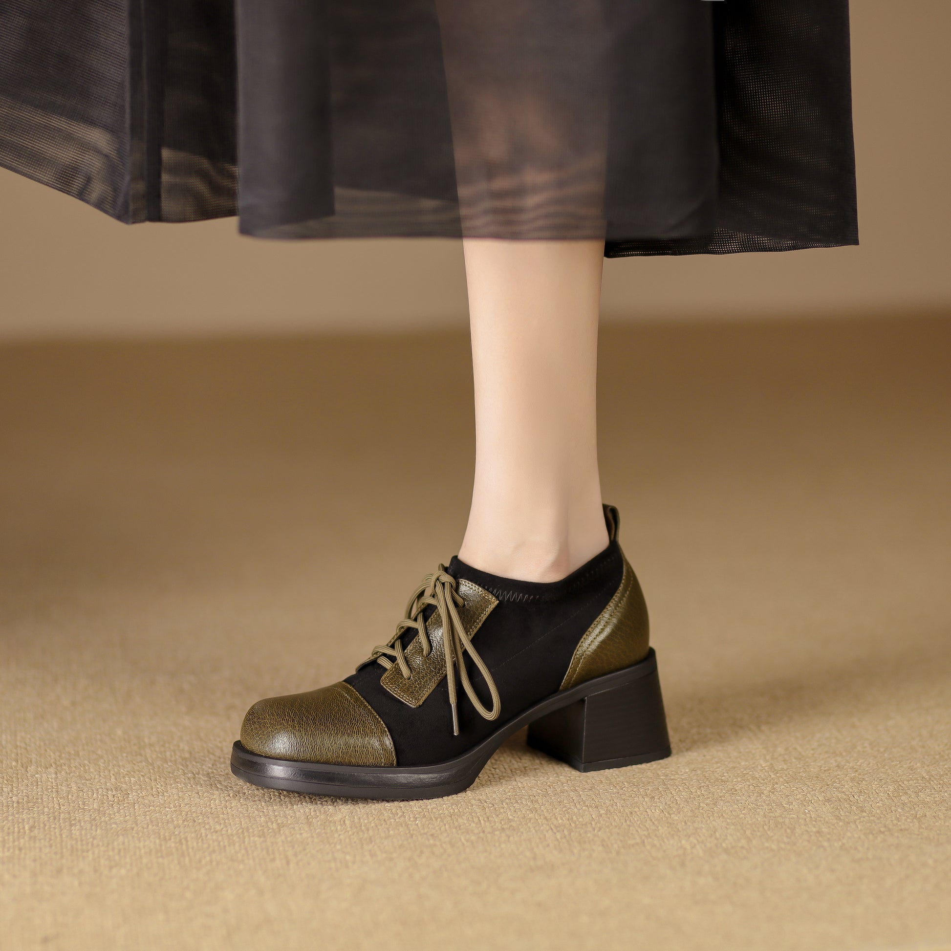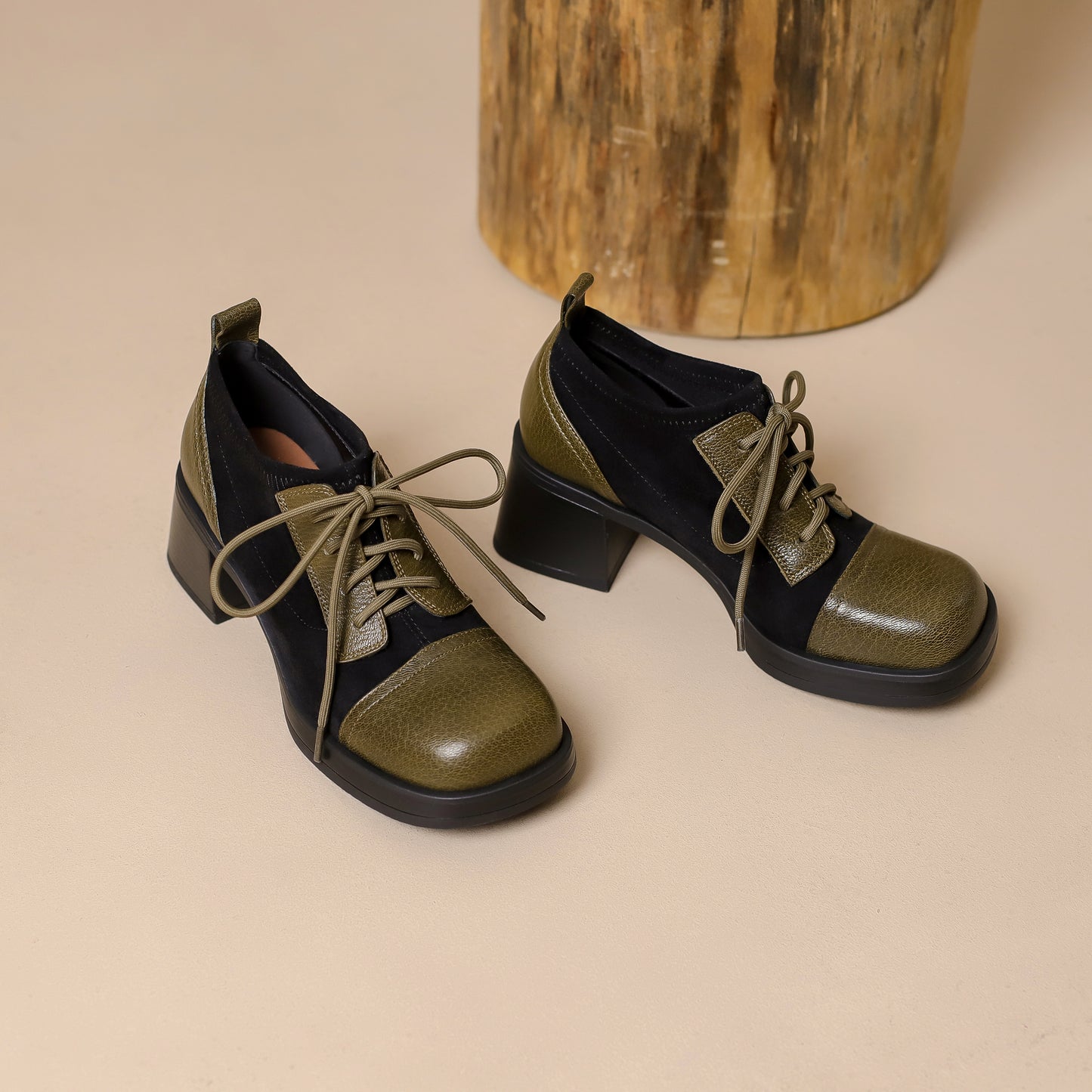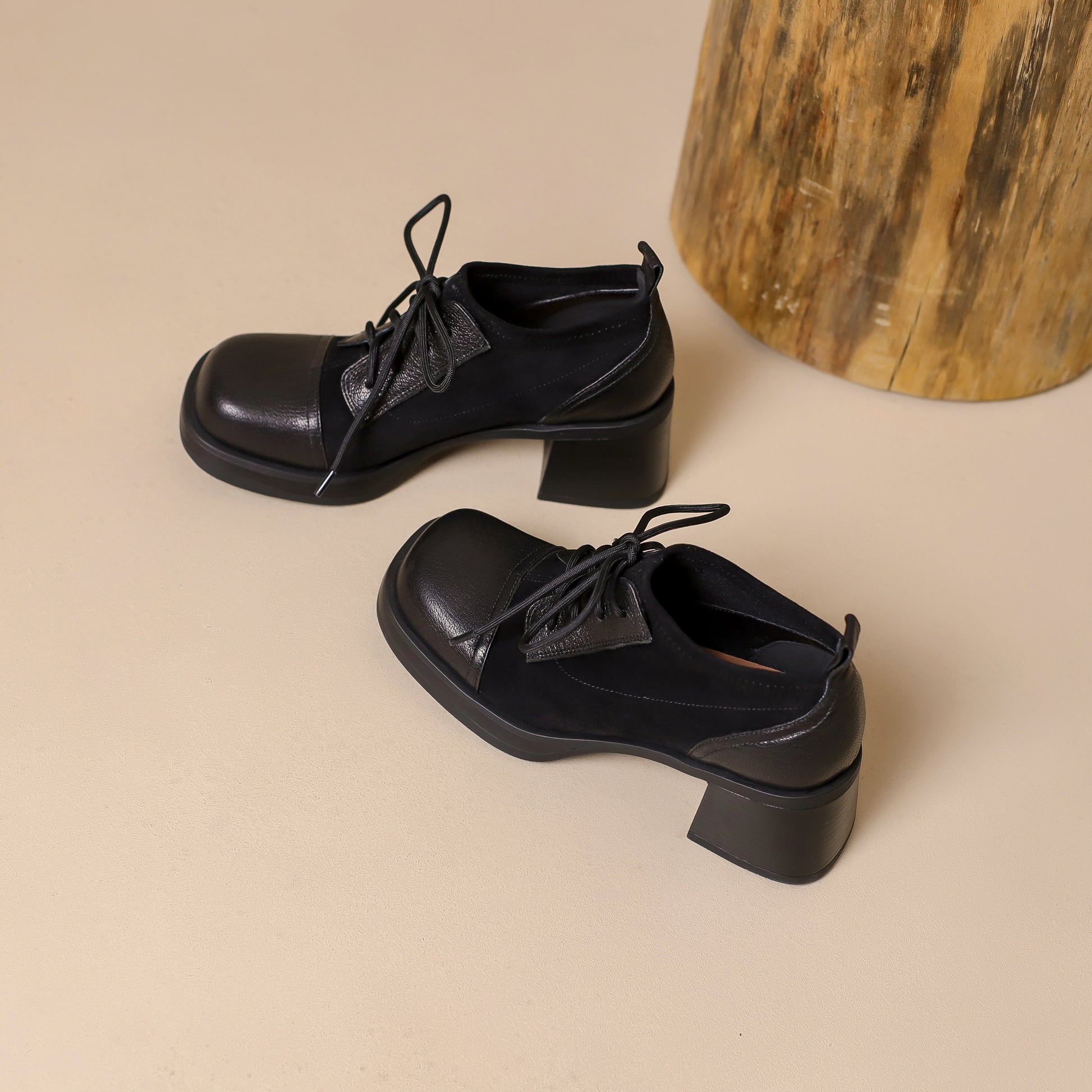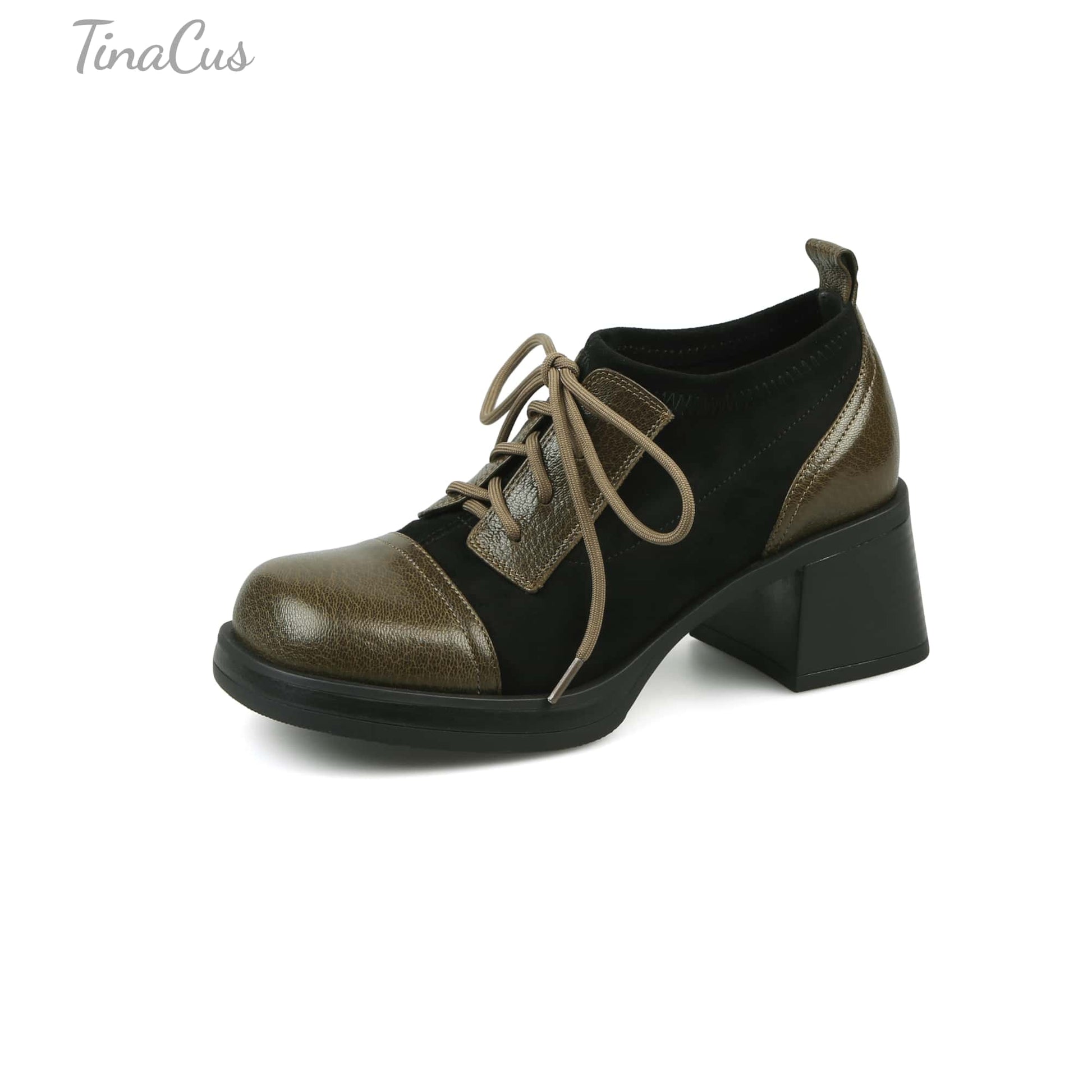 TinaCus Women's Genuine Leather Handmade Splicing Lace Up Square Toe Platform Mid Block Heel Pumps Shoes