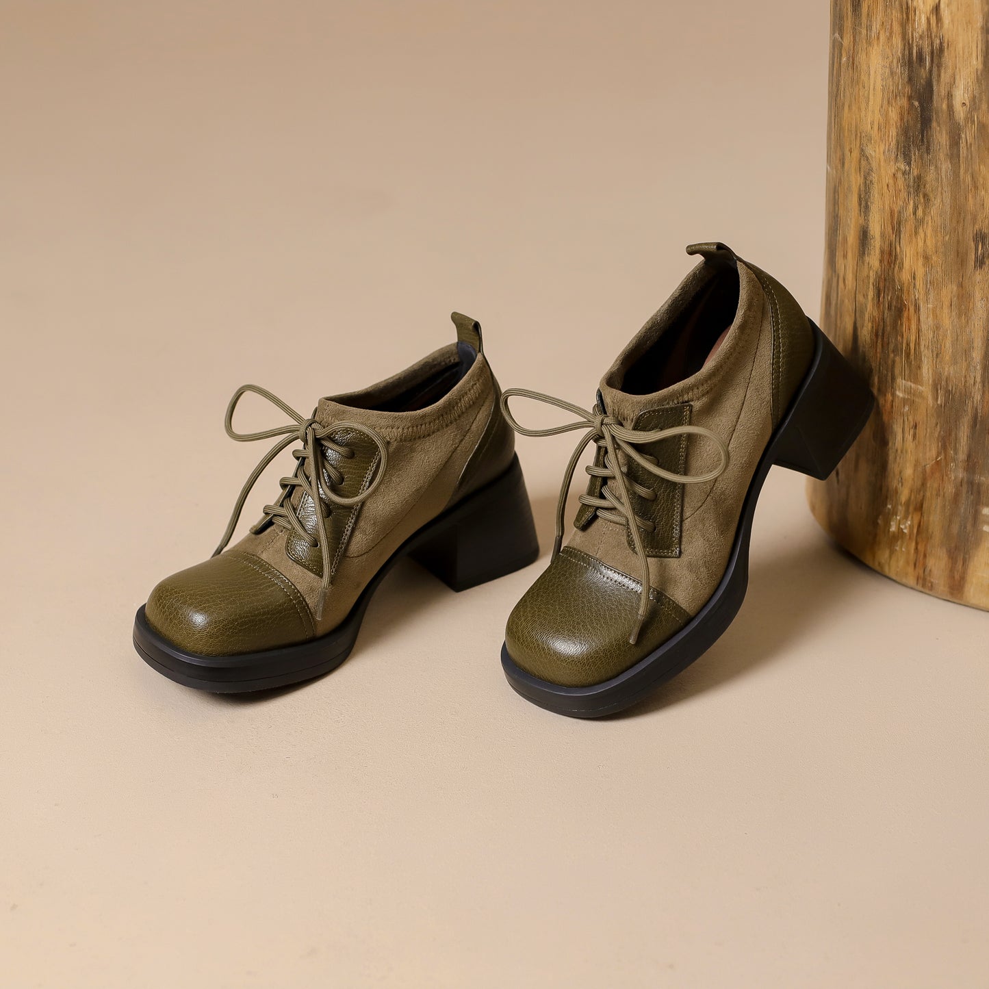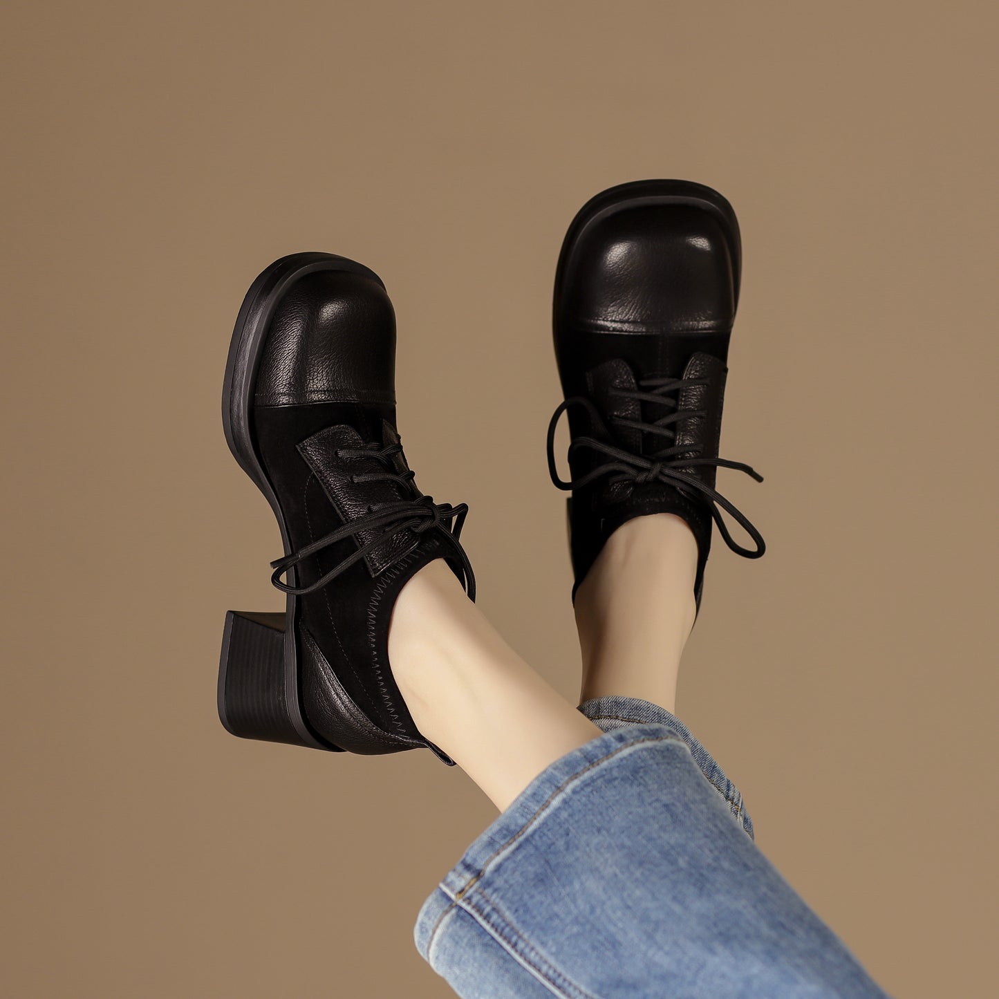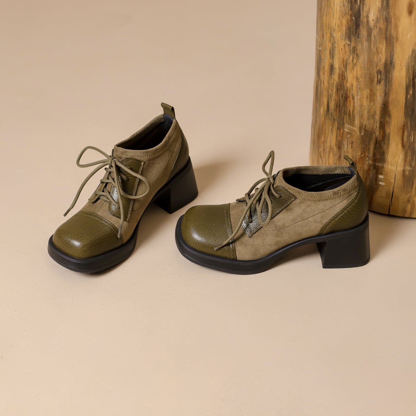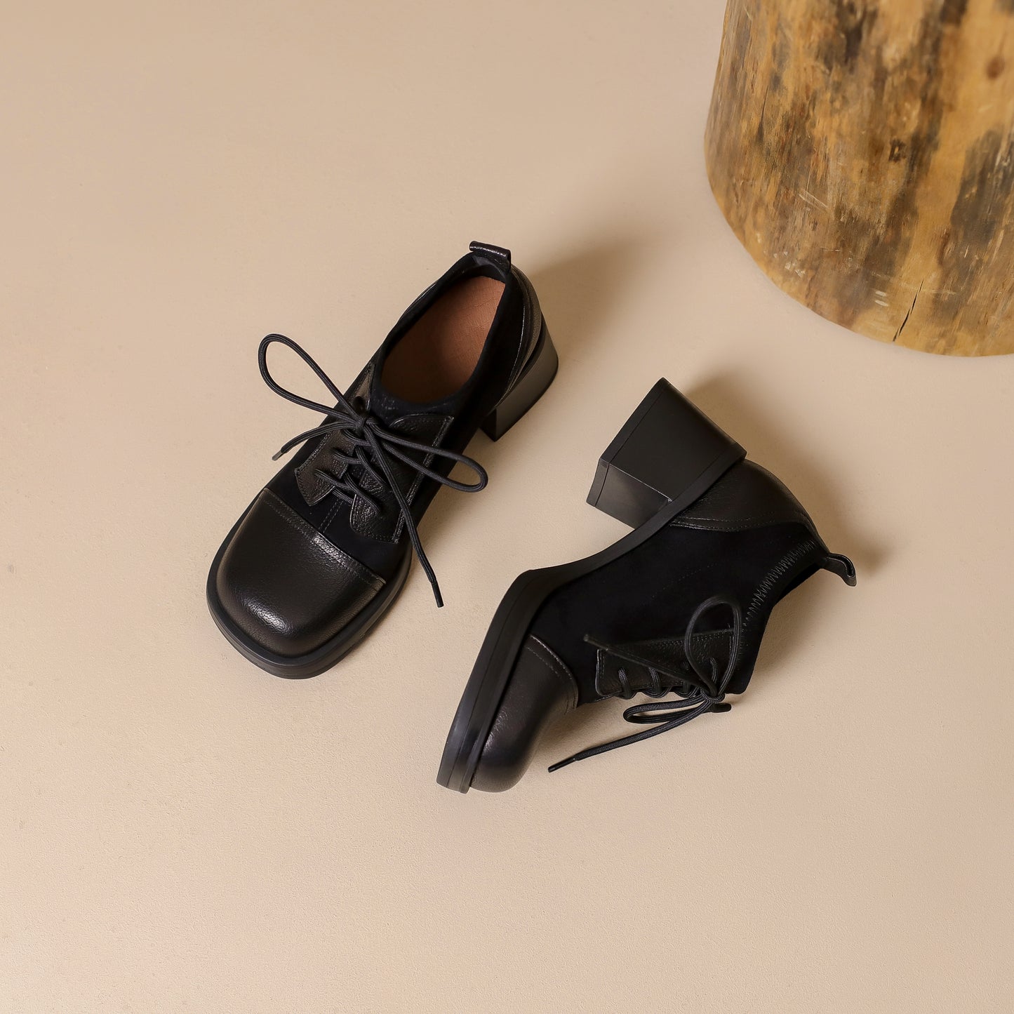 TinaCus Women's Genuine Leather Handmade Splicing Lace Up Square Toe Platform Mid Block Heel Pumps Shoes