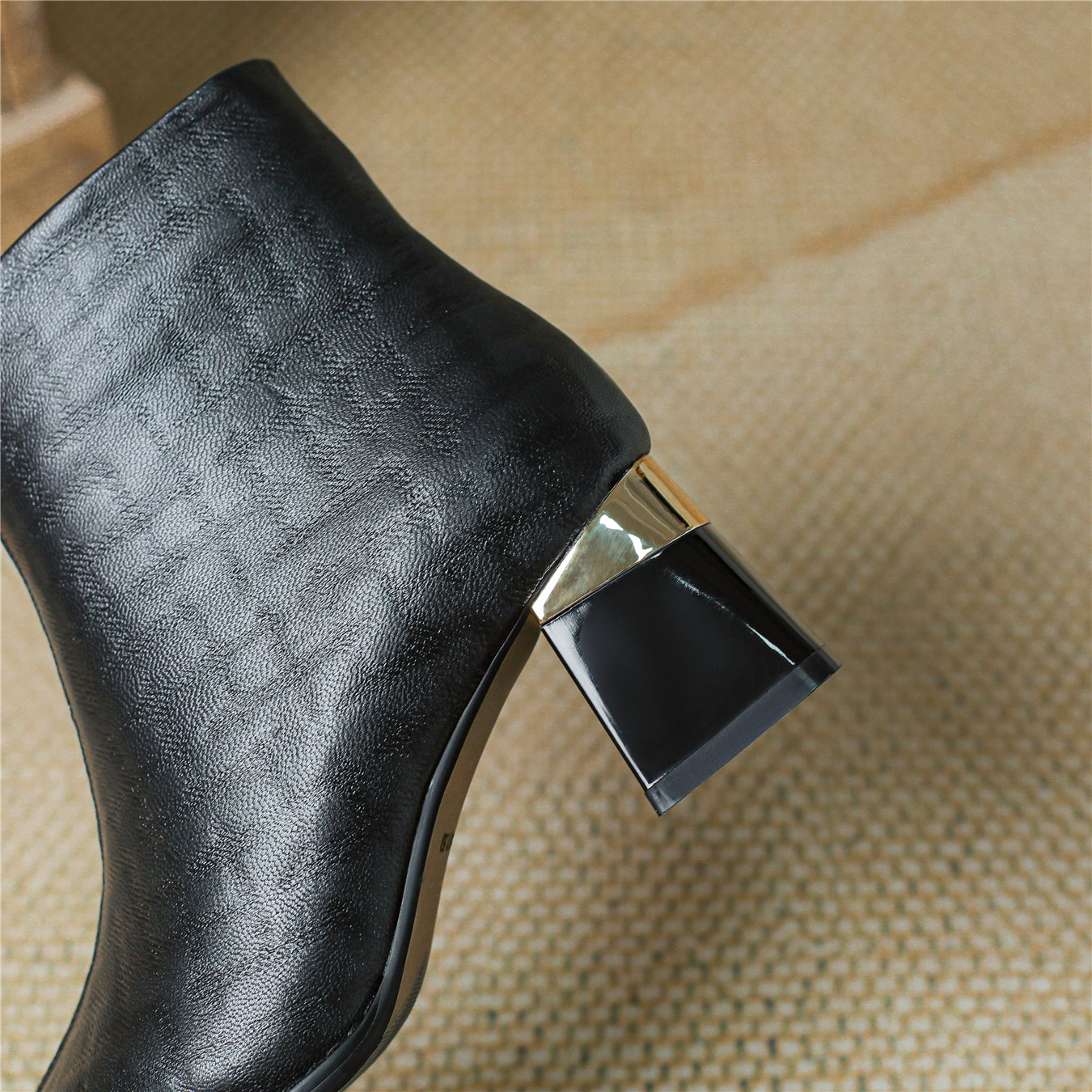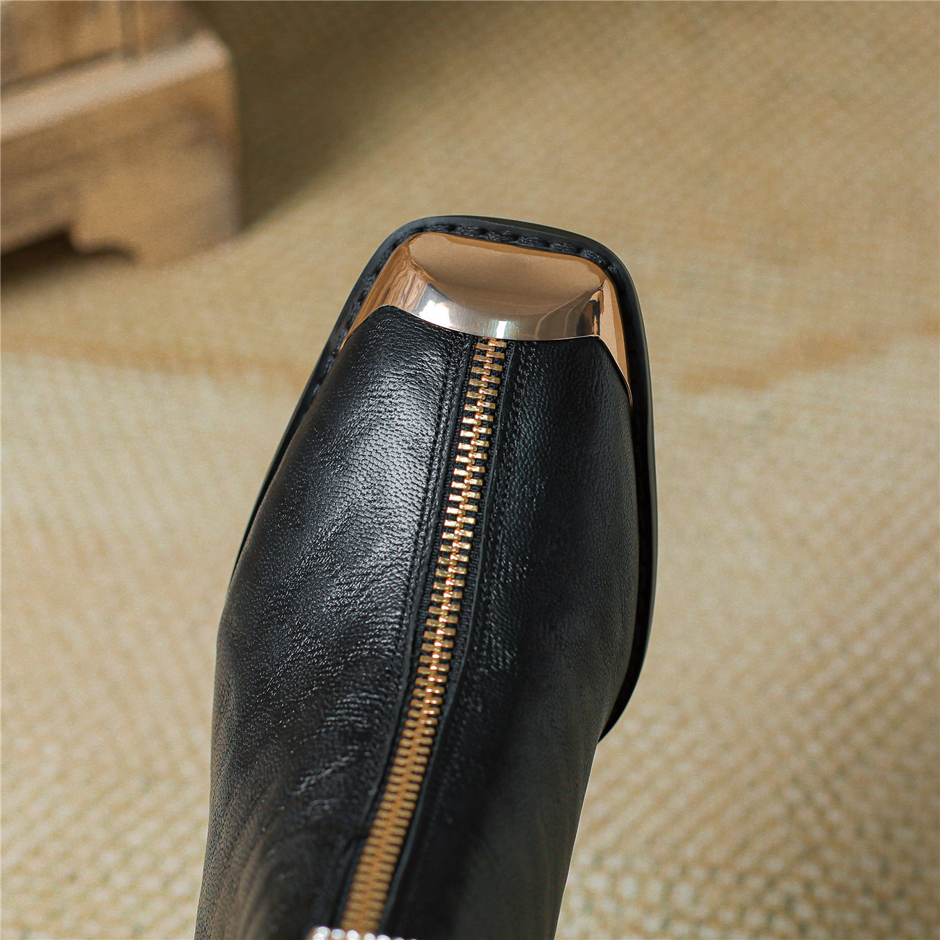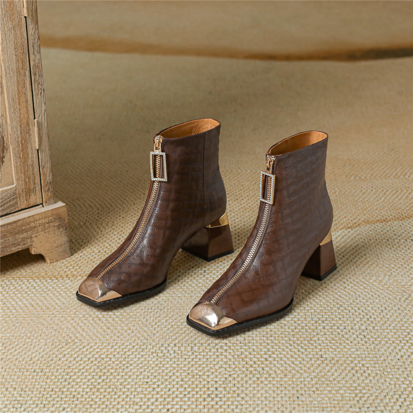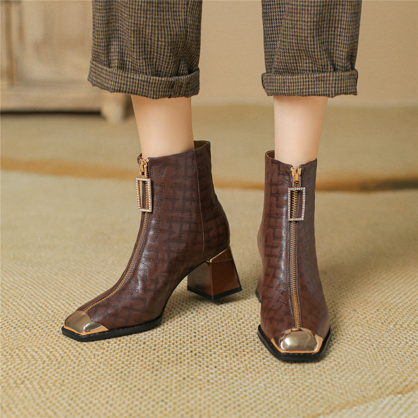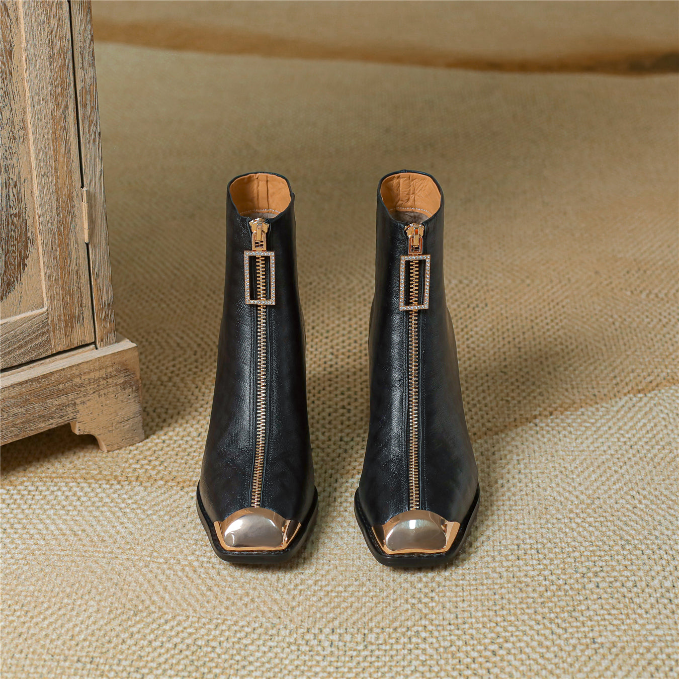 Ankle boots are designed with square toe, genuine leather, zip and chunky heel.
