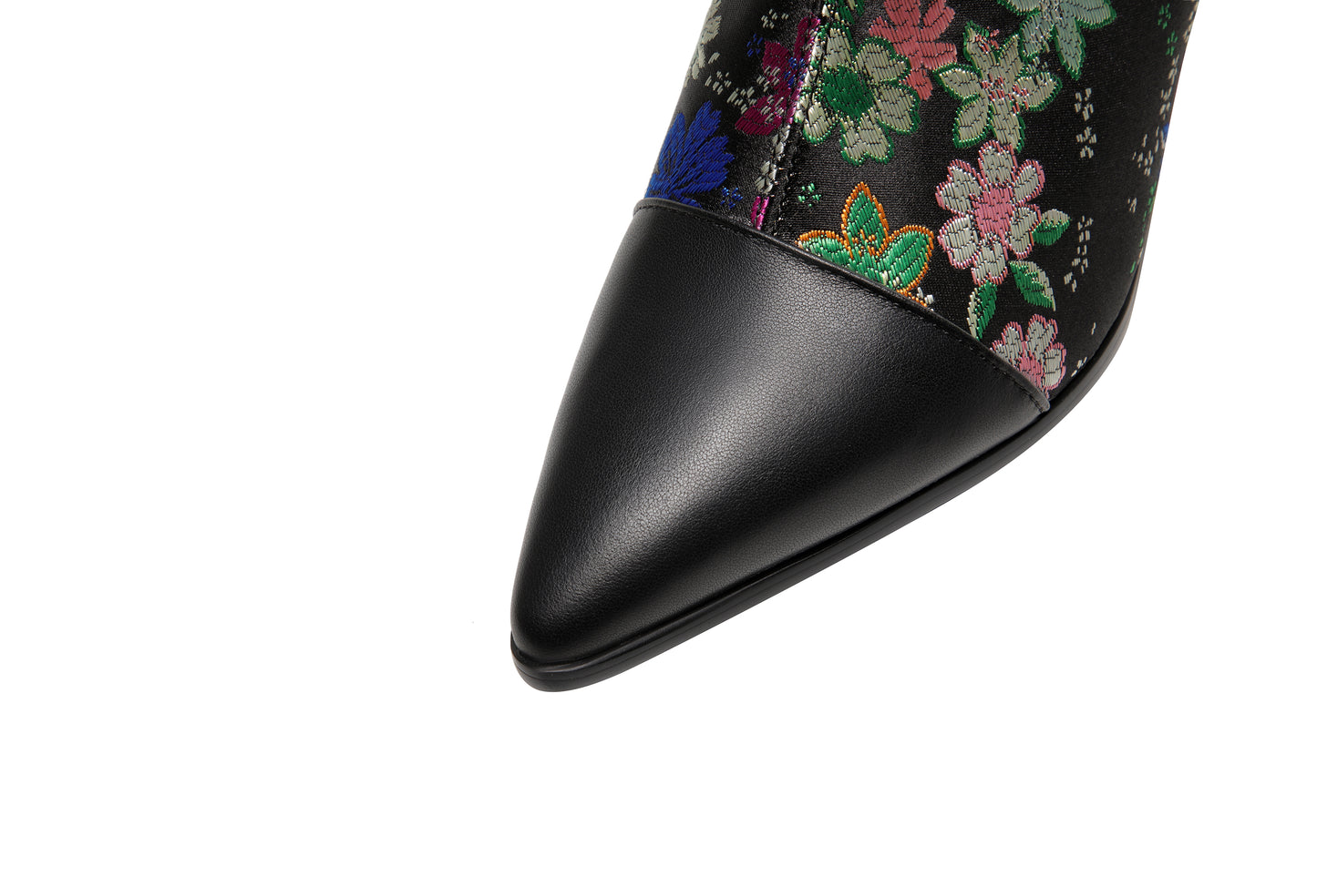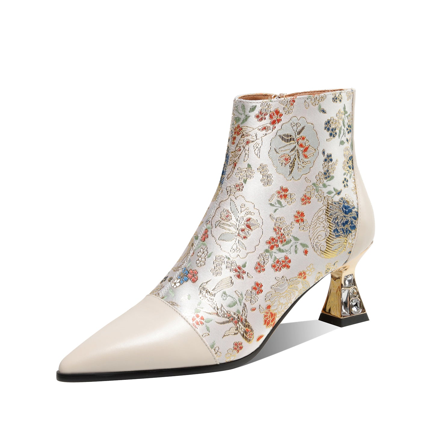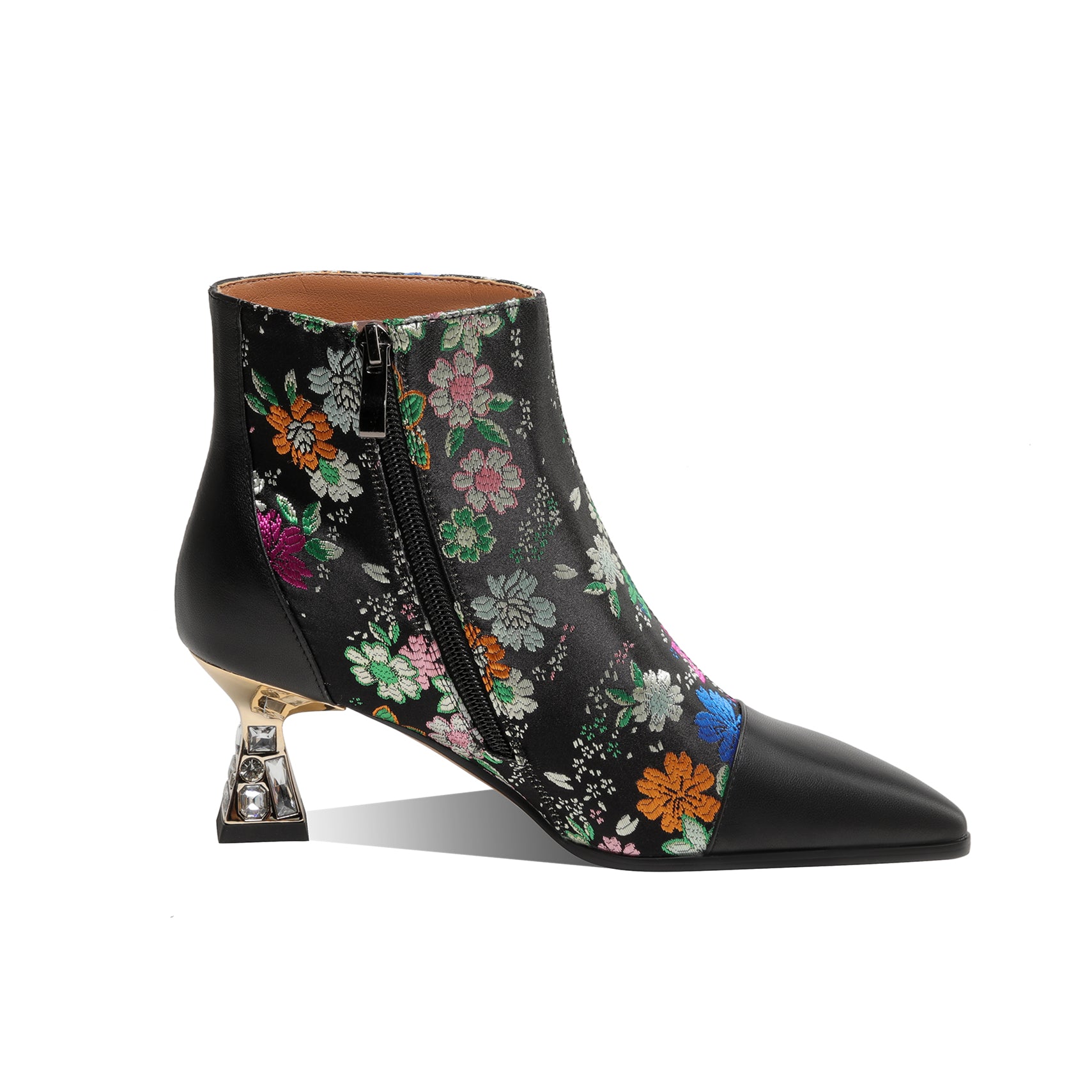 Ankle boots are designed with genuine leather, embroidered flower and zip up to keep up with fashion trend.