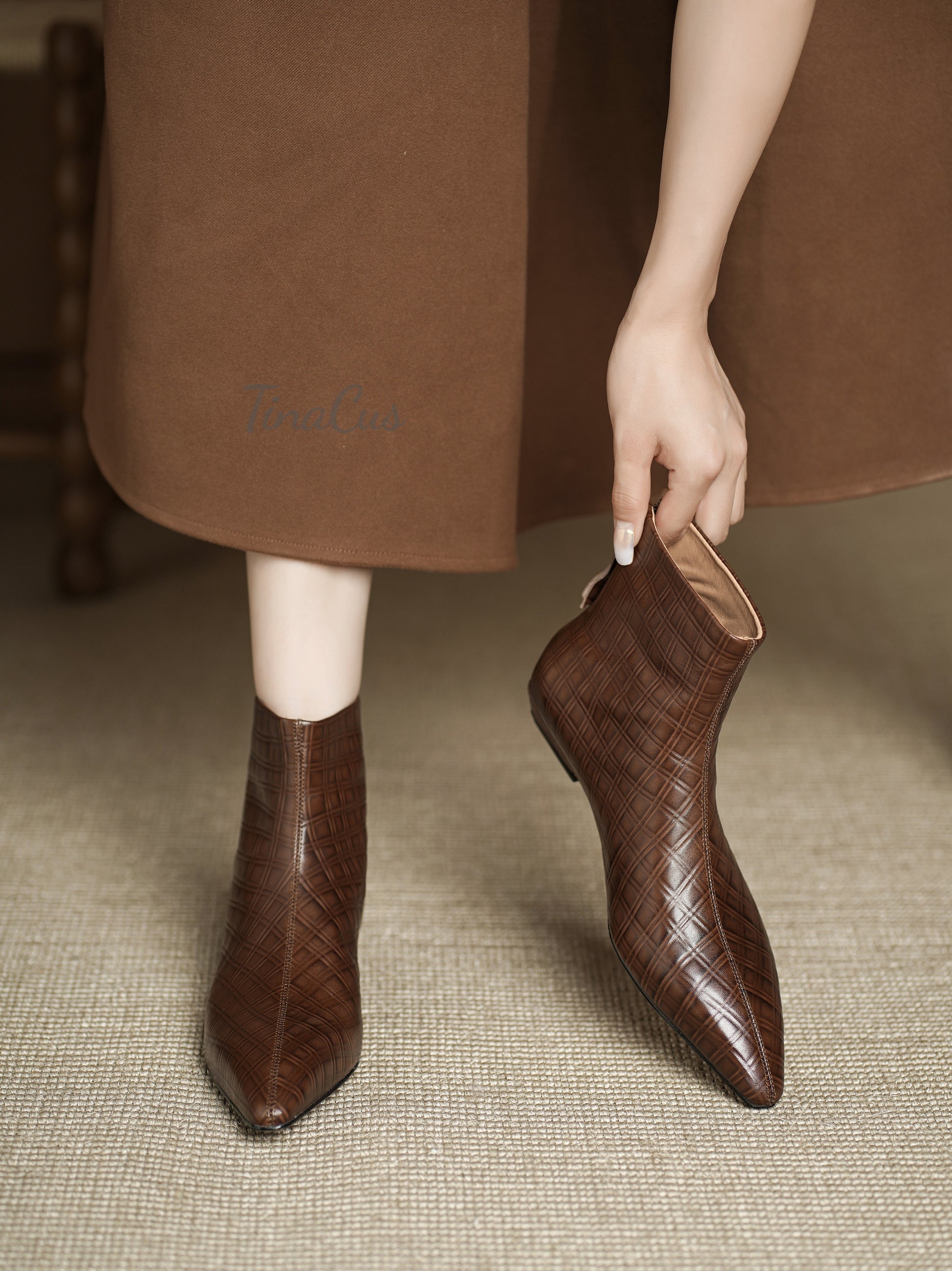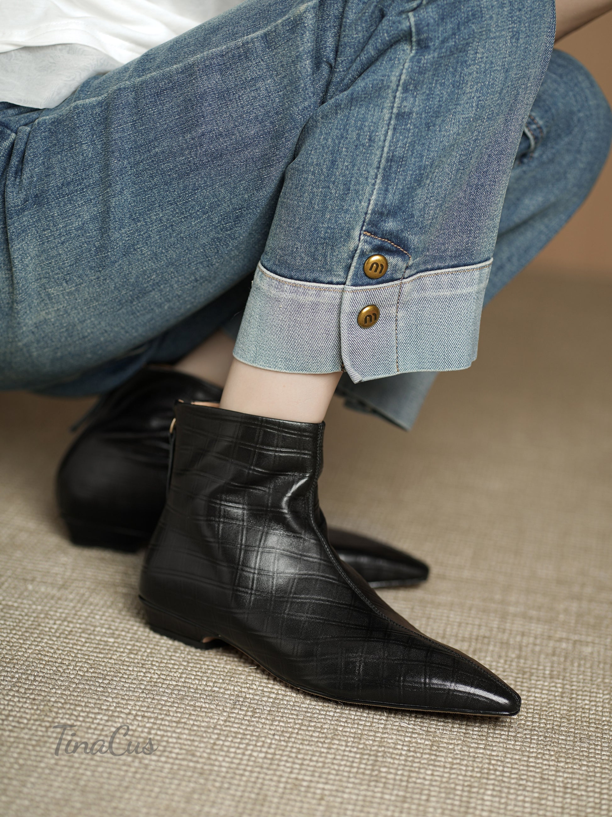 Ankle boots designed with pointed toe, back zipper, embossed genuine leather and flats can go with kinds of outfits