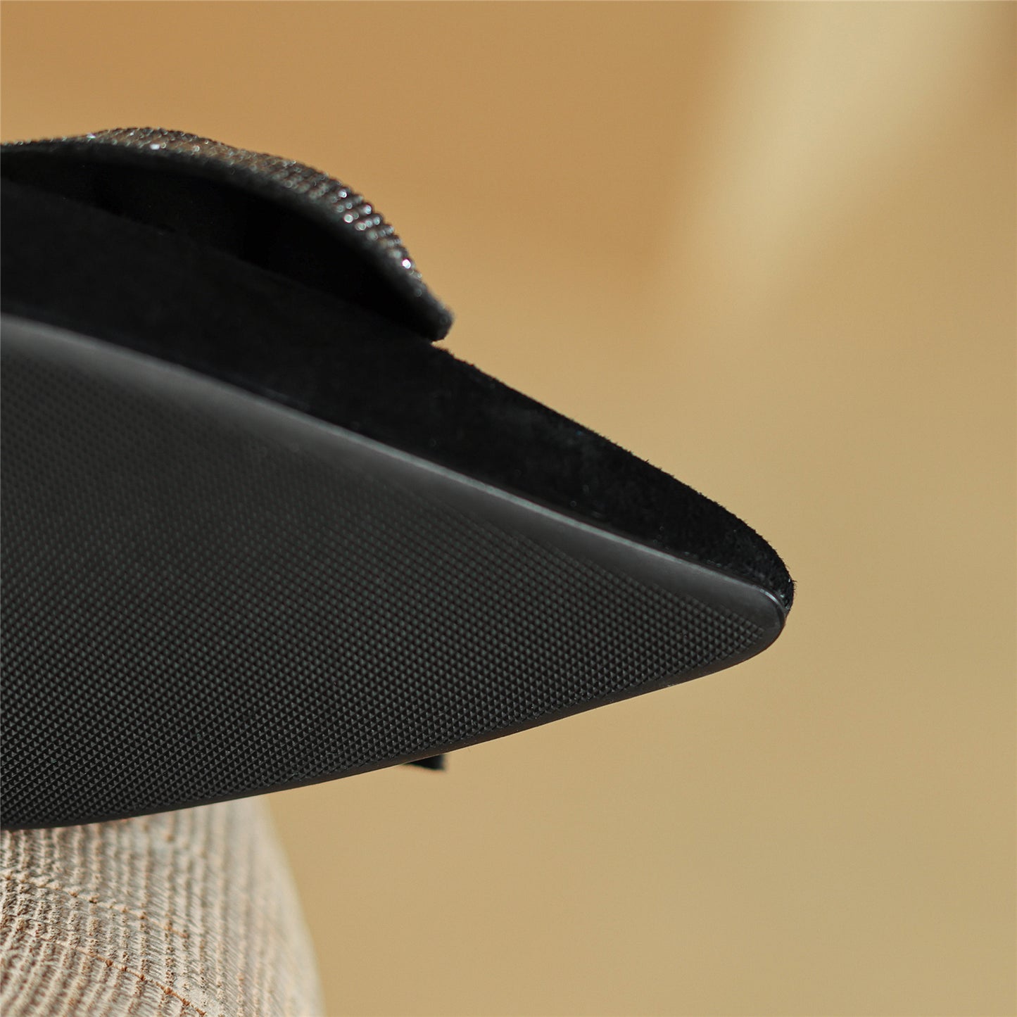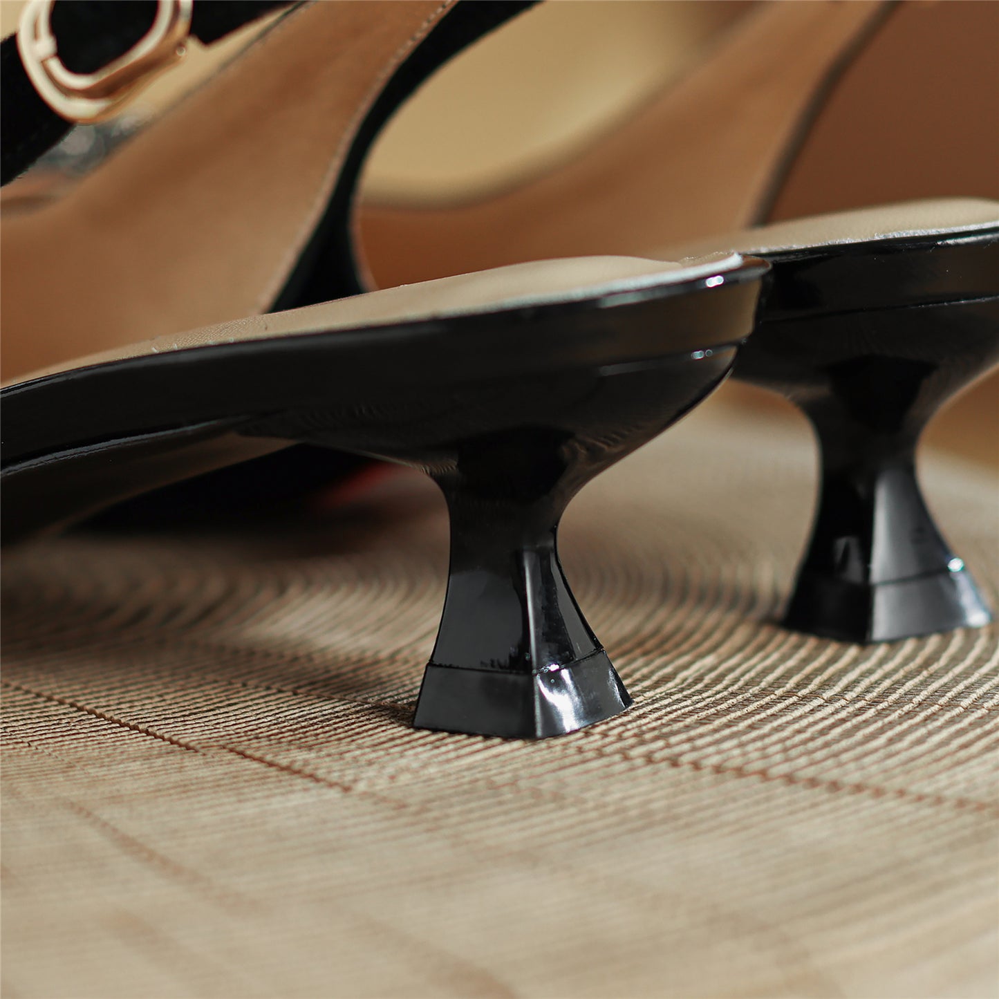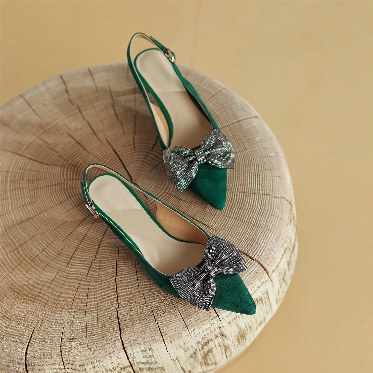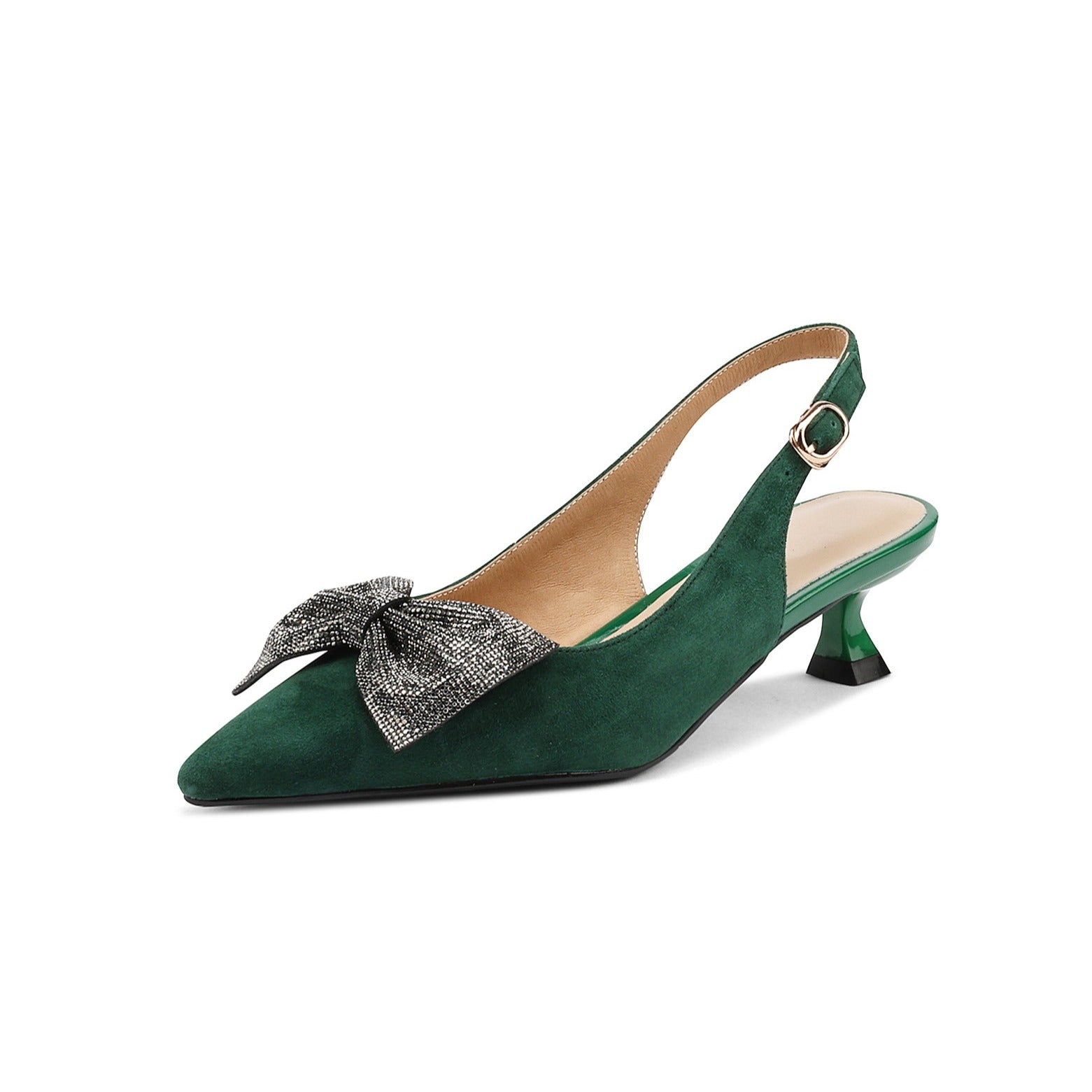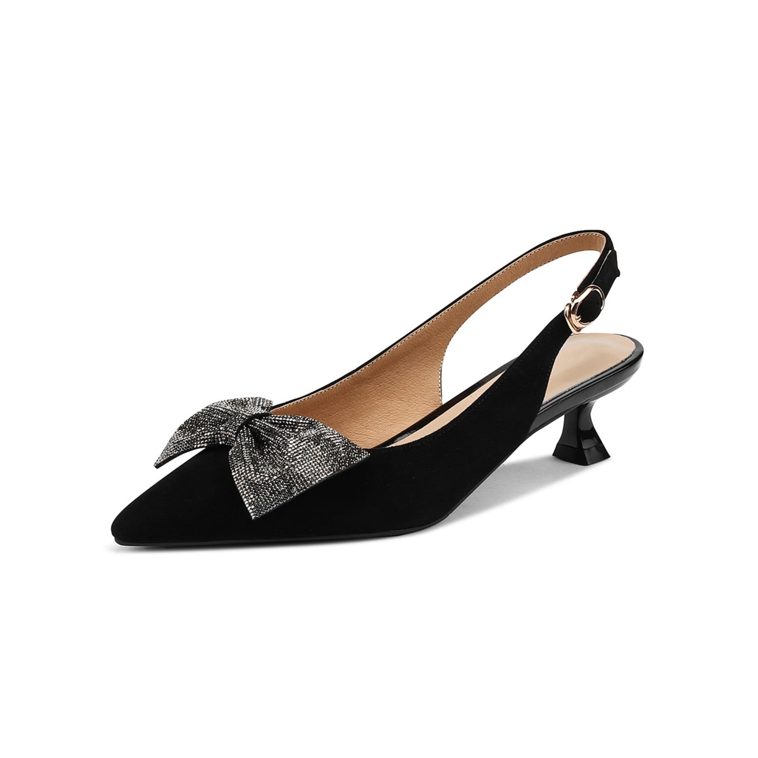 Cute slingbacks designed with suede leather, pointed toe, bowknot and kitten heel to keep up with fashion trend.