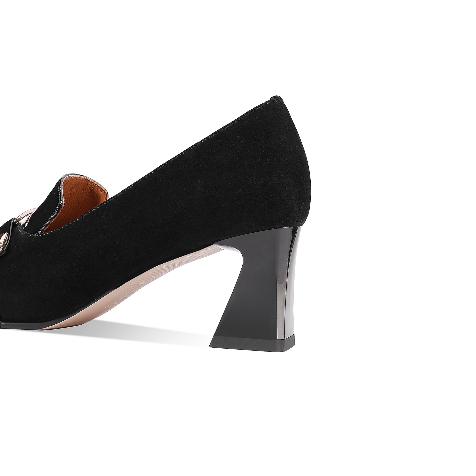 Pumps shoes with pointed toe, zipper, metal buckle, patent leather, suede leather and mid heels can go with kinds of outfits