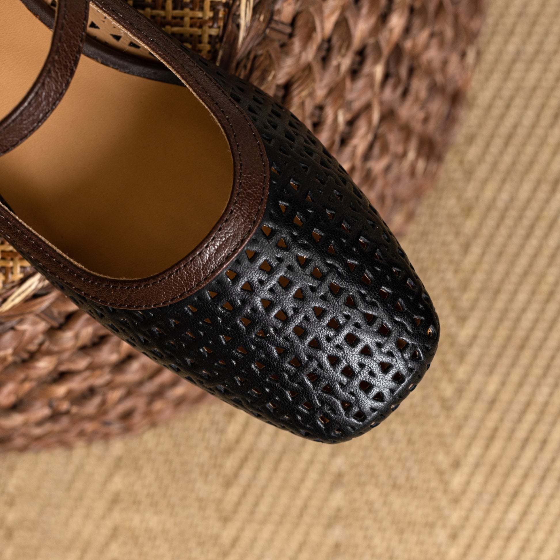 TinaCus Women's Square Toe Genuine Leather with Holes Low Chunky Heels Handmade Mary Jane Shoes
